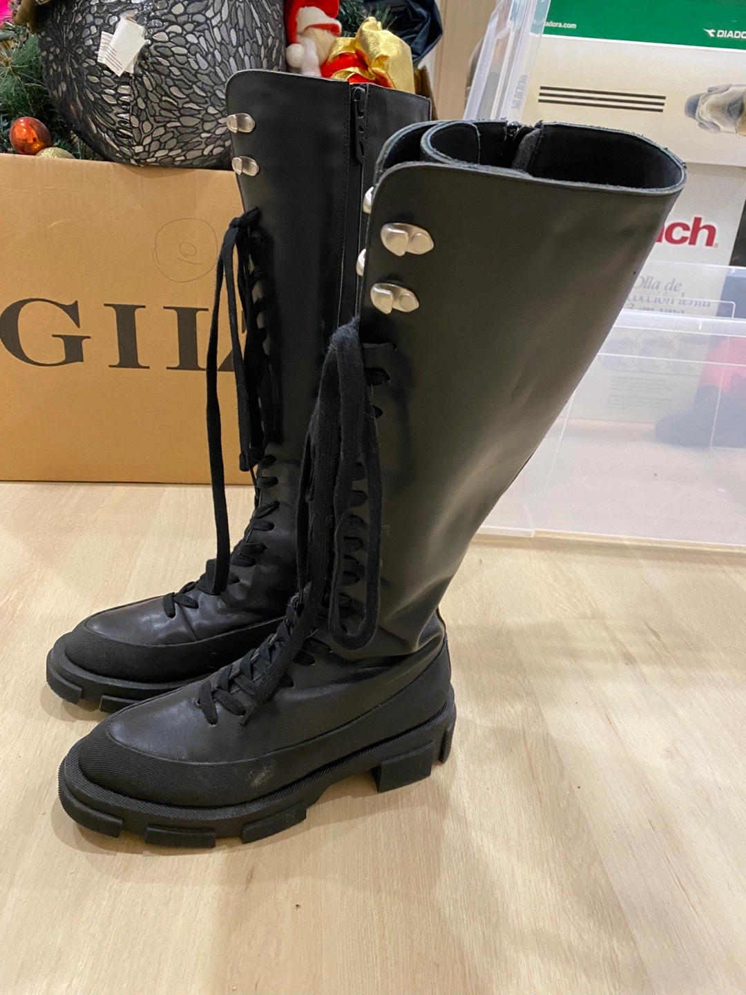 Pair of black leather knee-high boots. Lace-up detail and chunky sole. Size 36.