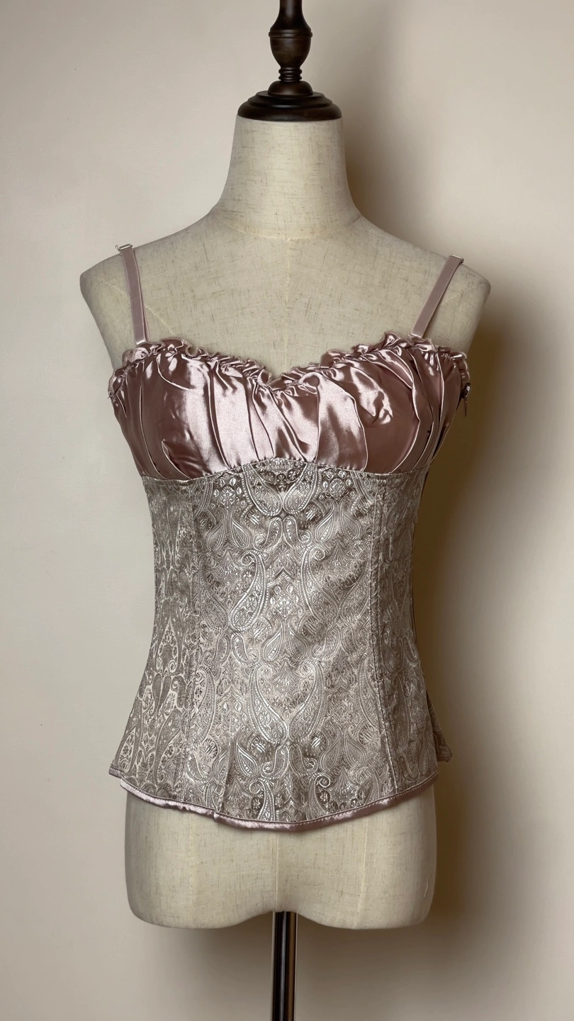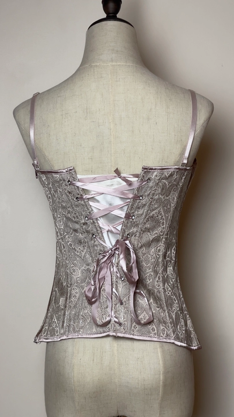 Beautiful corset top. Features a champagne brocade fabric with a satin bust. Lace-up back and zipper closure. Looks great under a jacket or on its own.