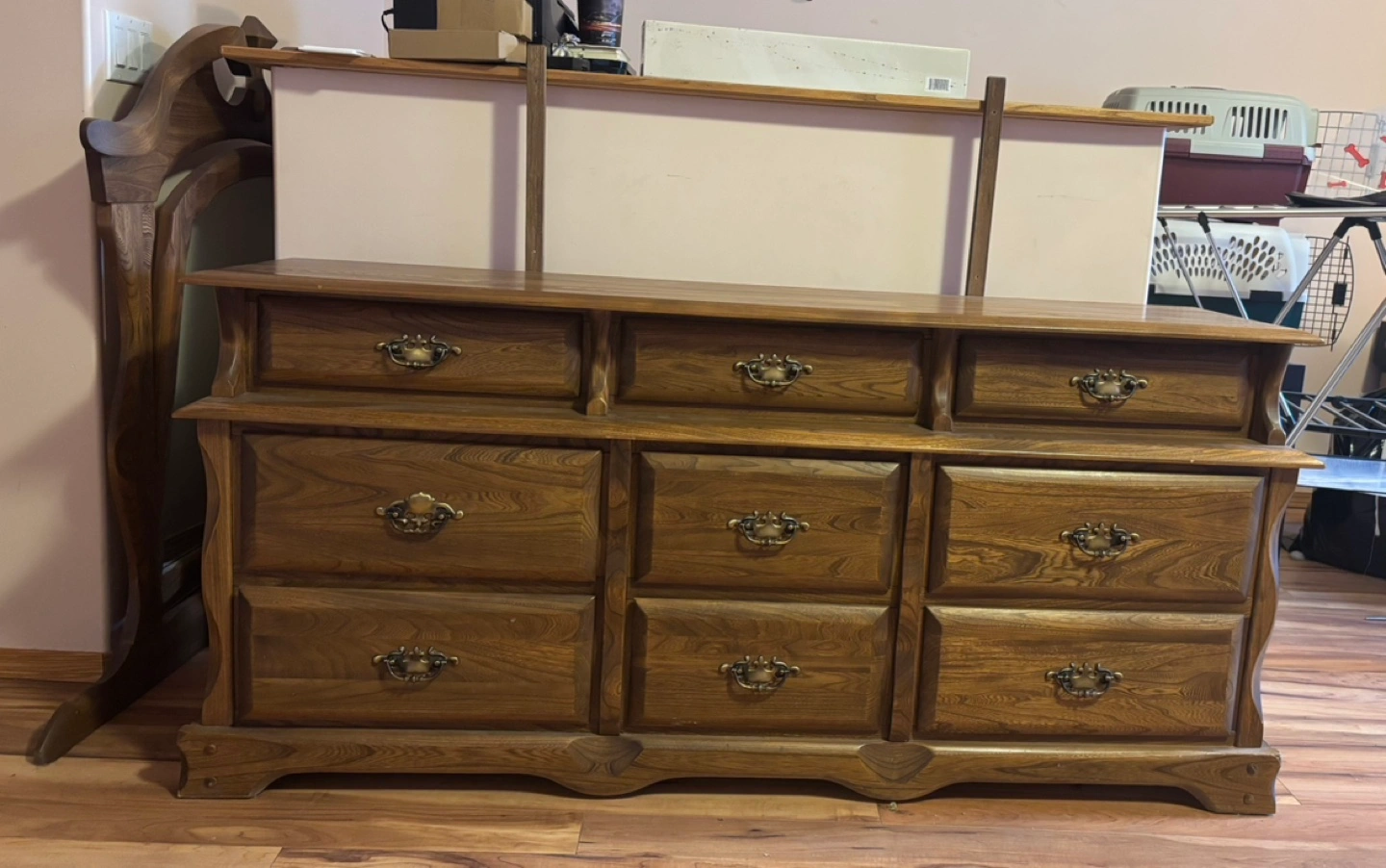 Beautiful vintage dresser and mirror set. Eight drawers, ornate details. Solid wood construction. Mirror features an arched top and decorative detailing. Perfect for bedroom or entryway.