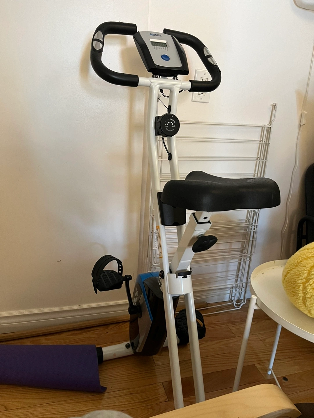 Compact vertical exercise bike. Great for small spaces. Features adjustable resistance and a digital monitor. Some wear and tear on the seat.