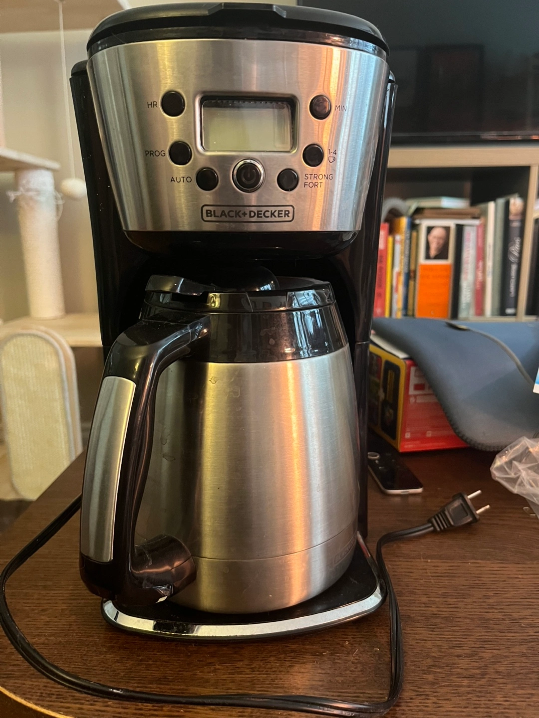 Programmable coffee maker 12 cups. Stainless steel thermal carafe. Digital display. Multiple brewing options. Basket filter.