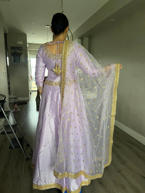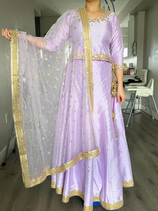 Beautiful lavender lehenga choli. Features gold embroidery and embellishments. Includes a matching dupatta. Three-quarter sleeves. Floor-length skirt. Perfect for weddings or special occasions.