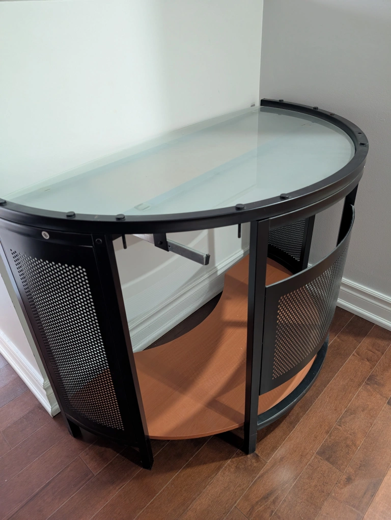 Half-circle computer desk. Black metal frame. Glass top. Lower shelf. Metal mesh sides. Good for small spaces.