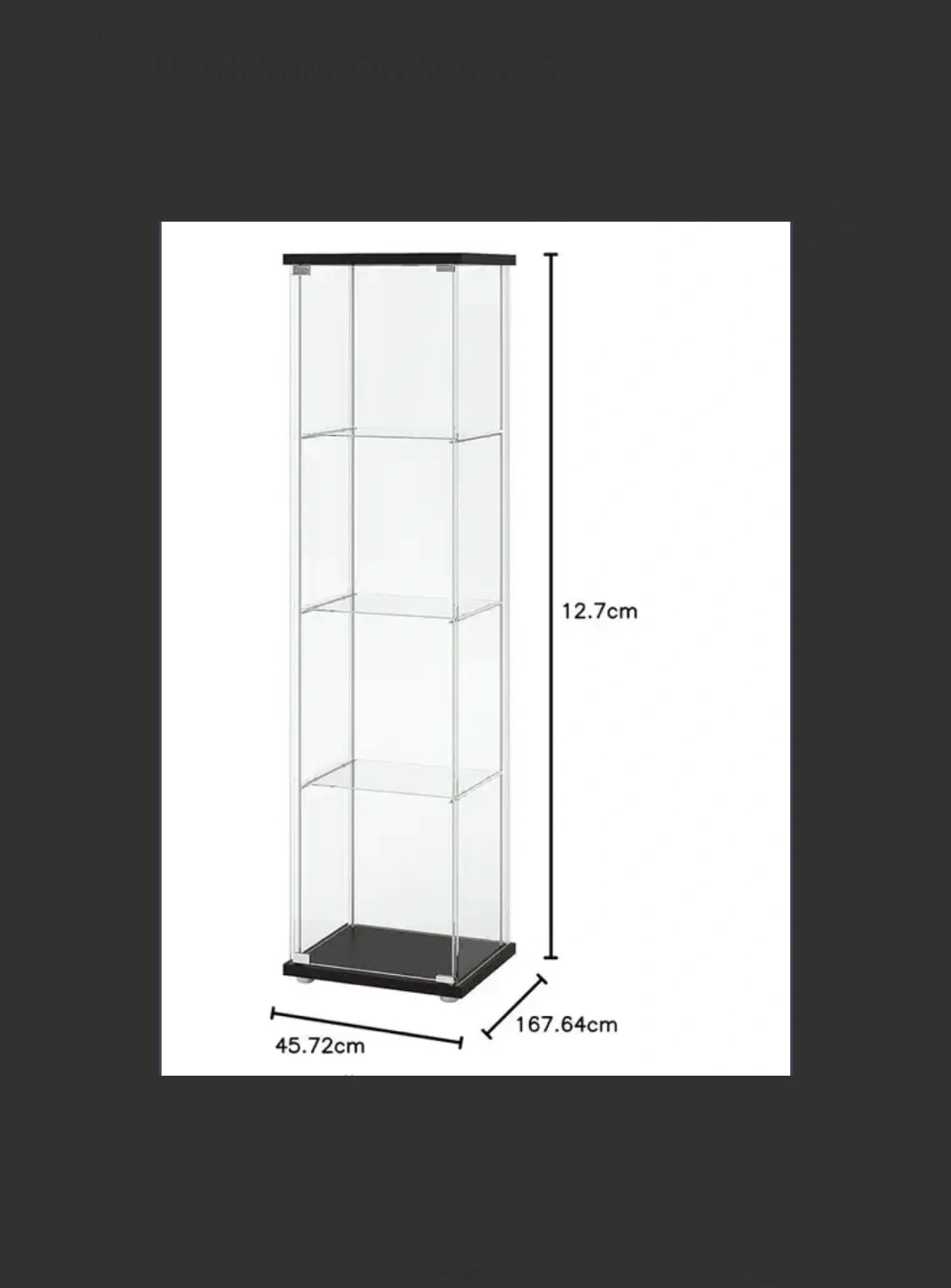 Total of 3 tall glass display cabinets. Black frames. Multiple shelves. Good for collectibles or showcasing items. Dimensions provided in image.