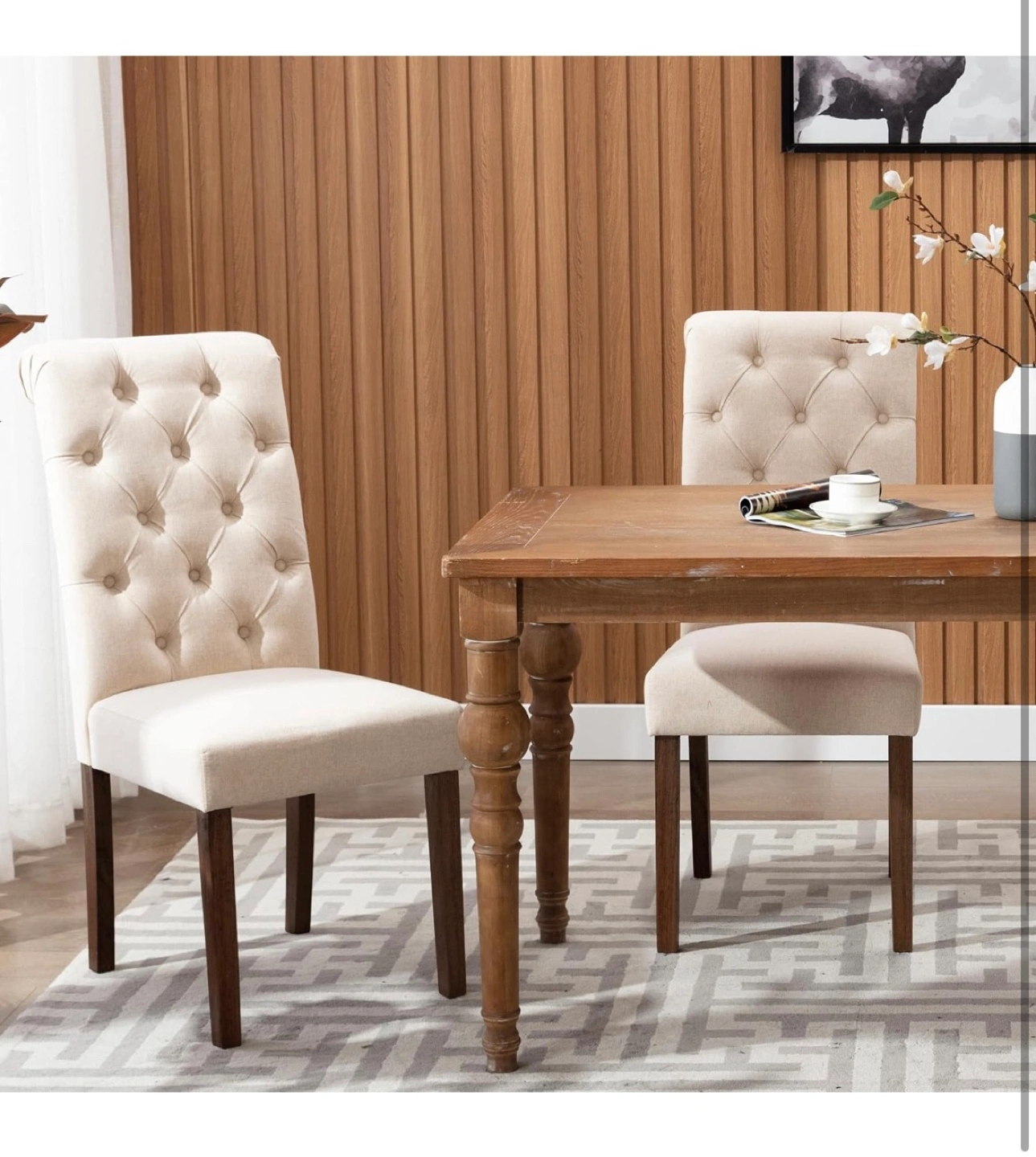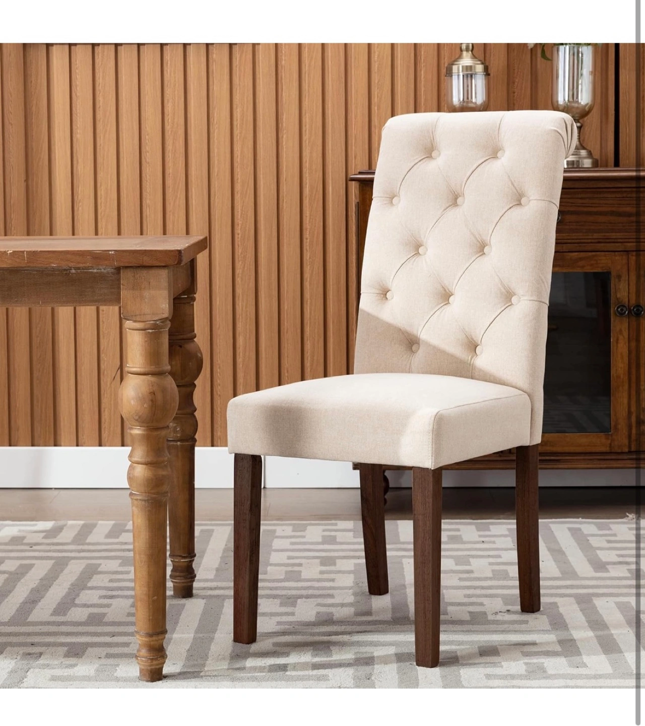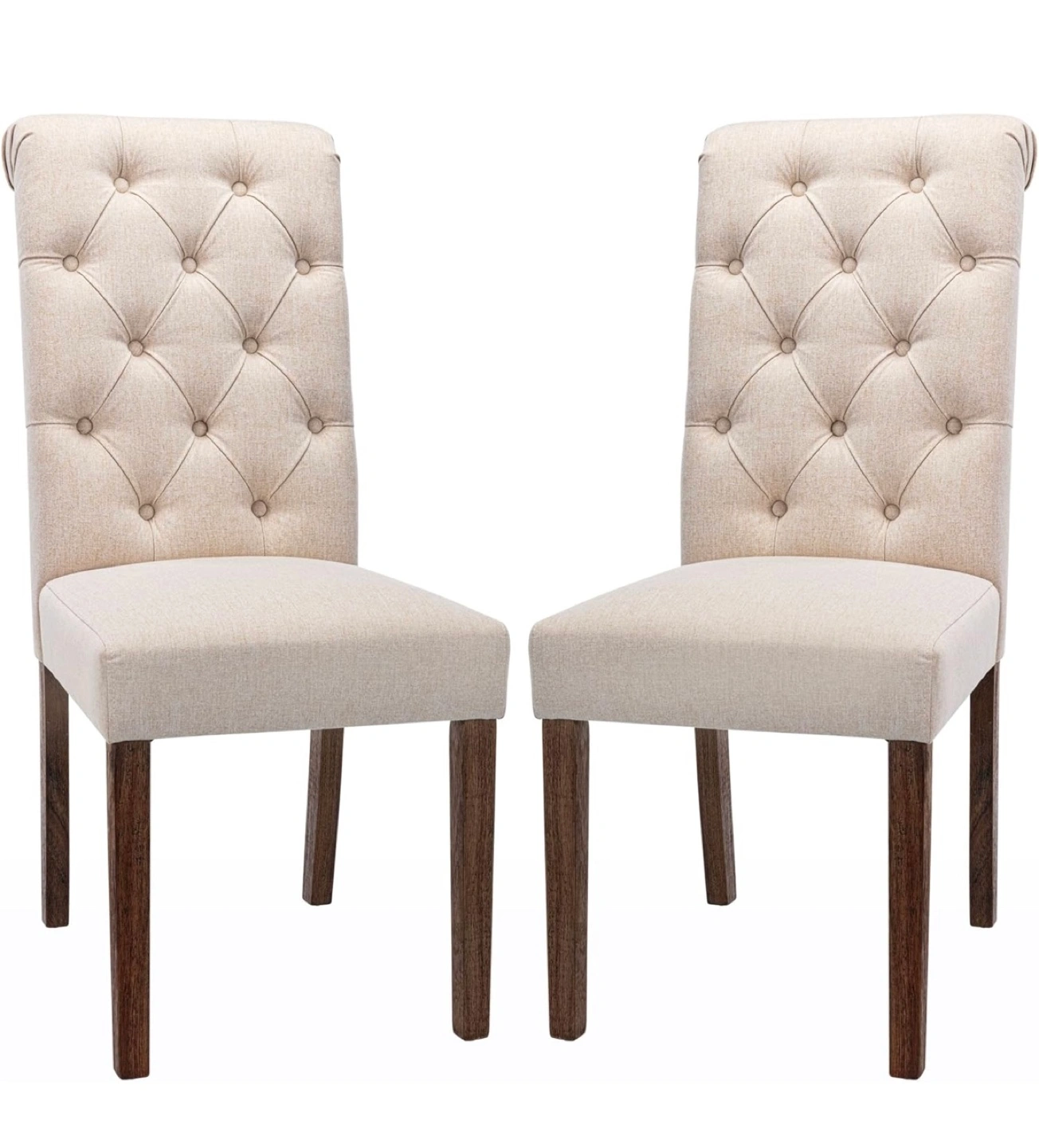 Pair of beige linen dining chairs. Button-tufted design. Dark brown wooden legs. Comfortable cushioned seat. Great for kitchen or dining room.