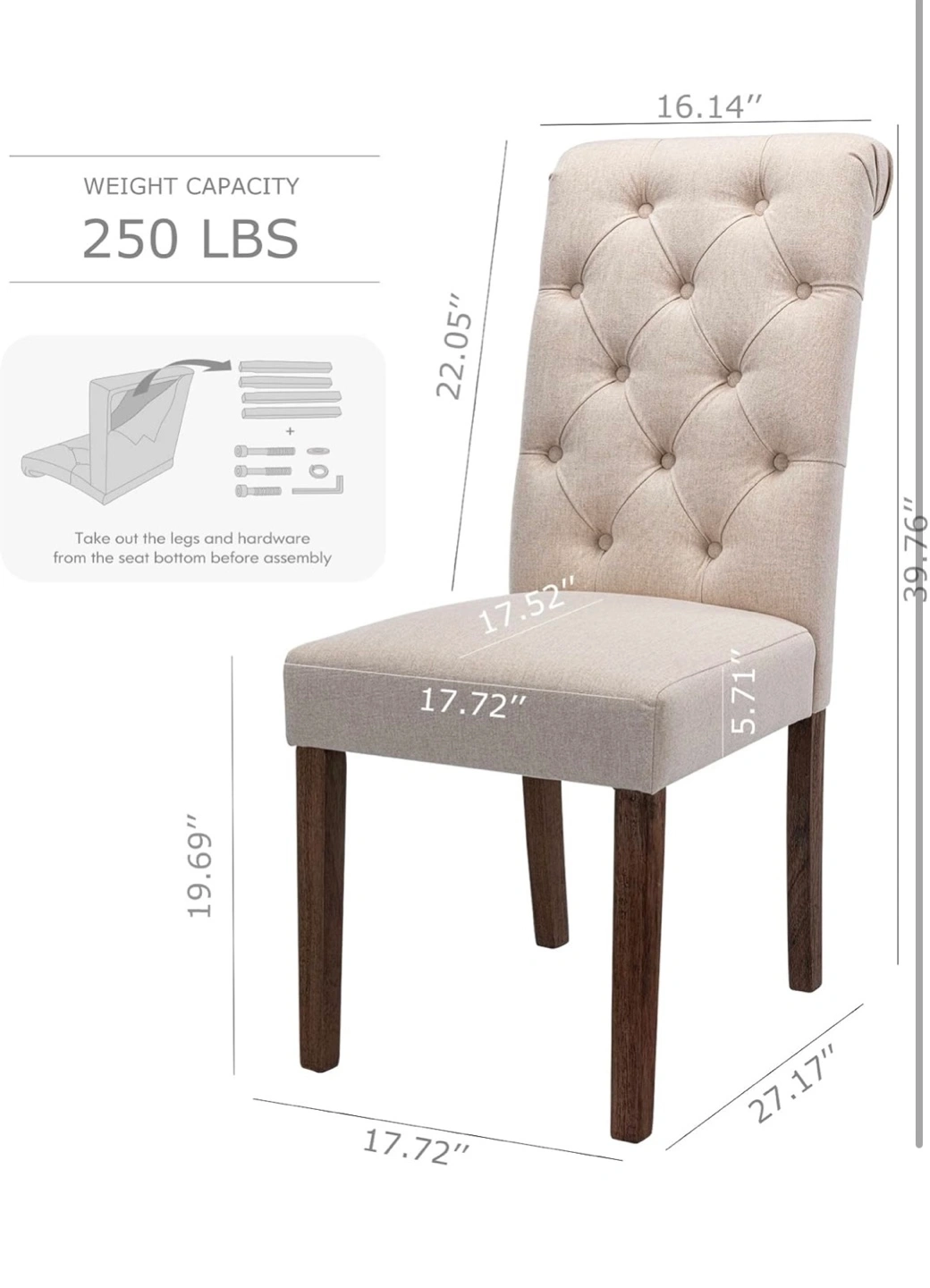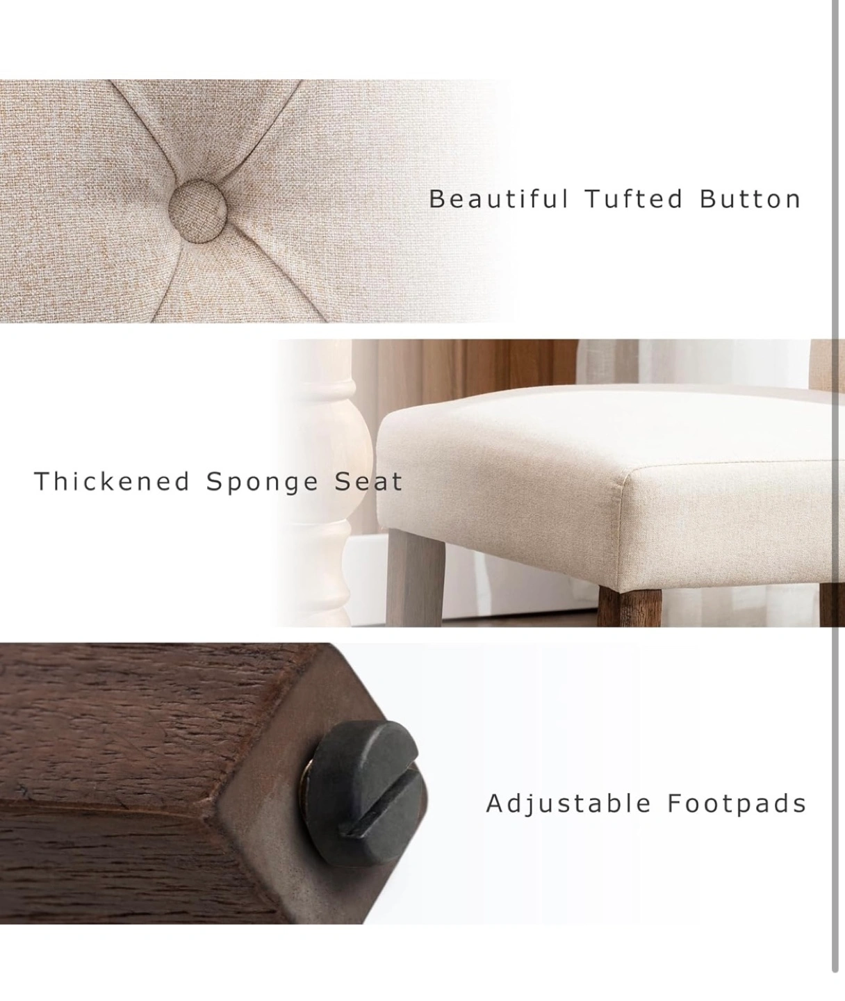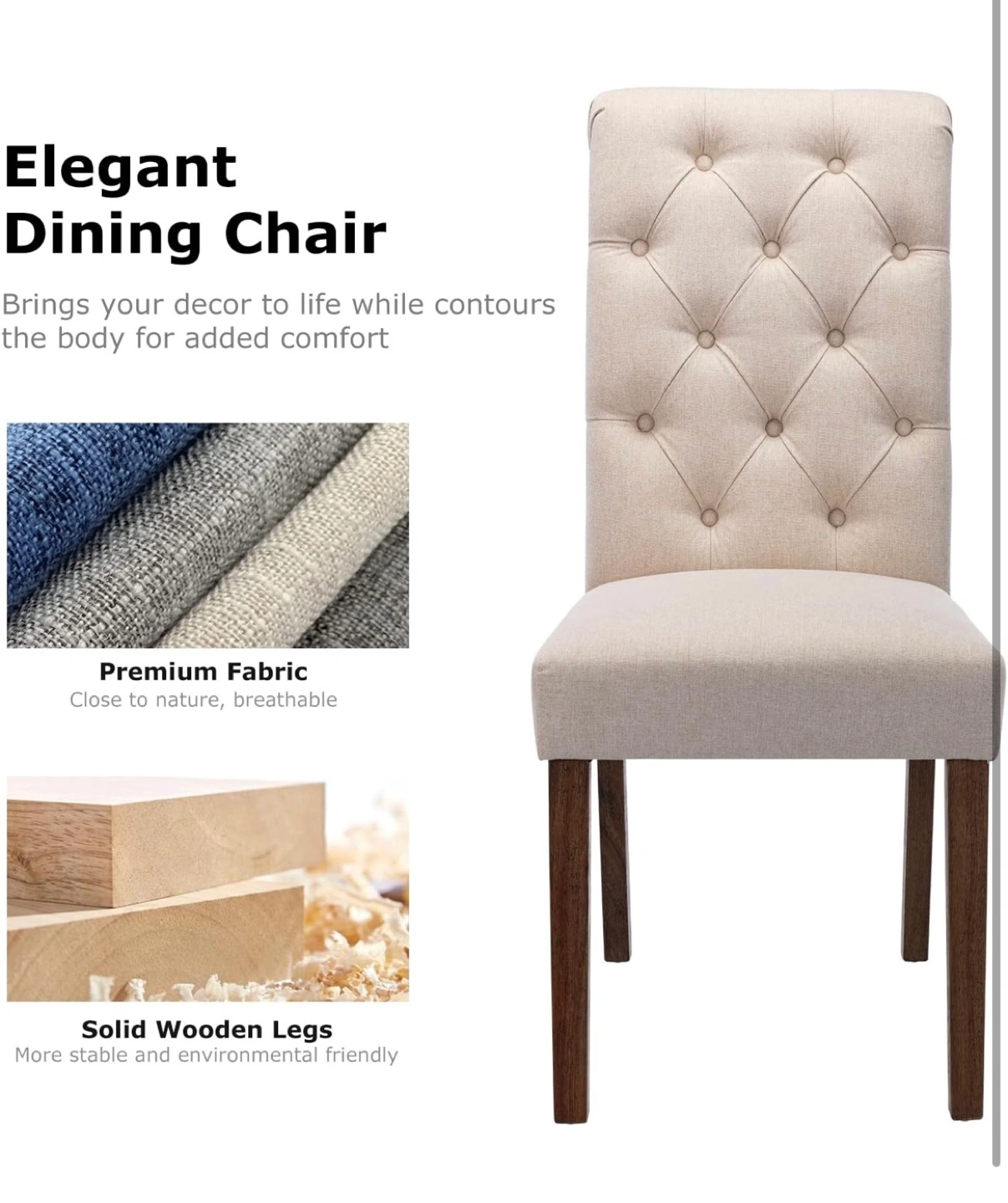 Pair of beige linen dining chairs. Button-tufted design. Dark brown wooden legs. Comfortable cushioned seat. Great for kitchen or dining room.