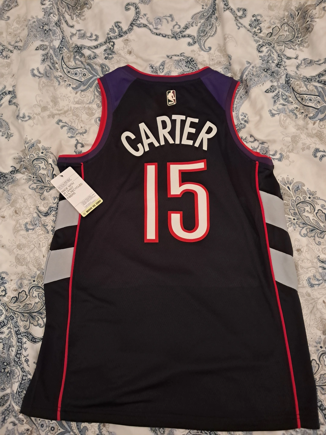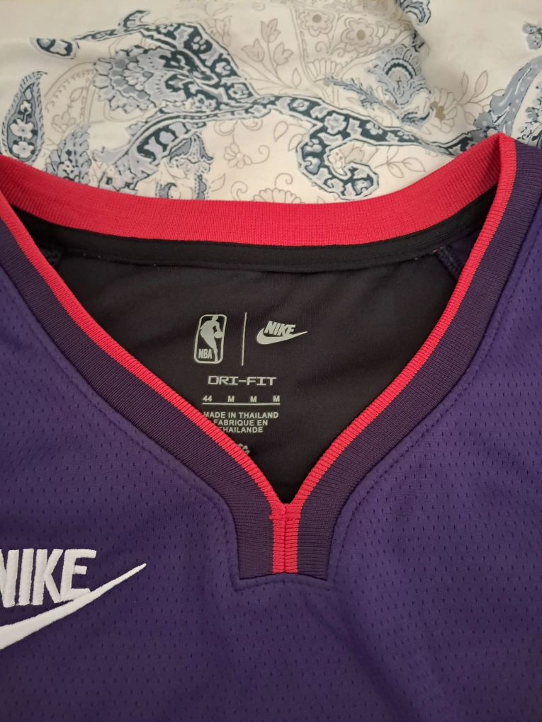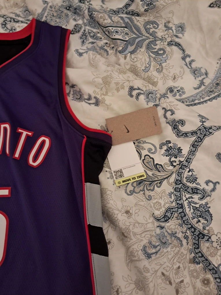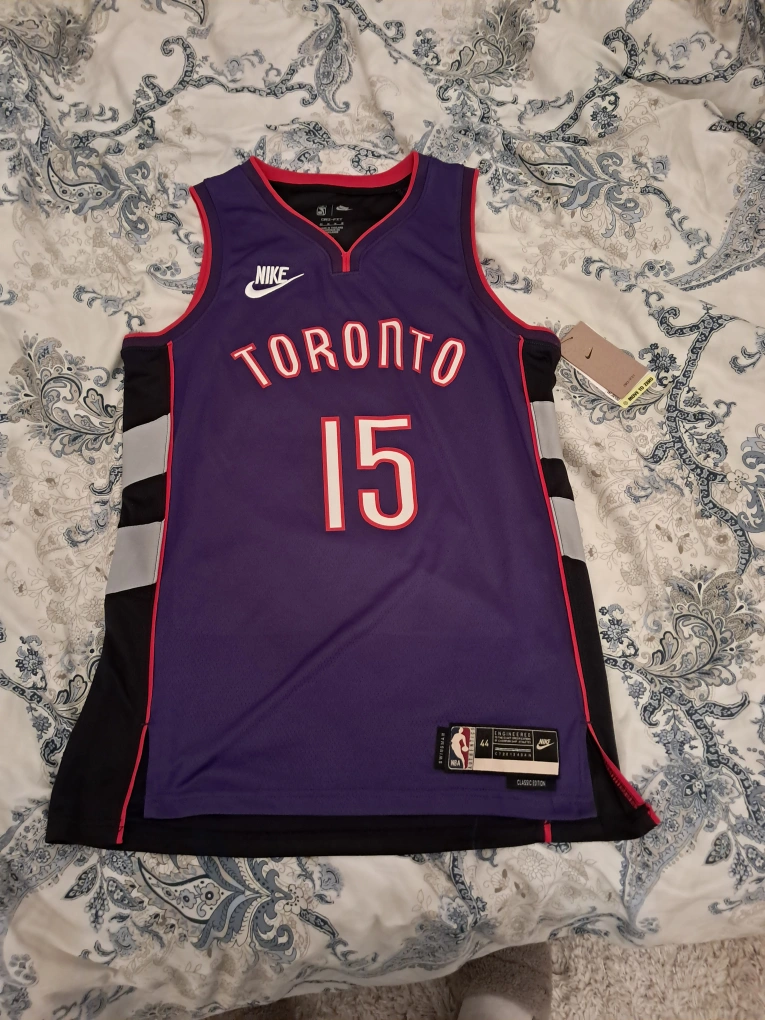 Purple Toronto Raptors jersey. Features Vince Carter's #15. Size Medium. Dri-FIT technology. NBA and Nike branding.