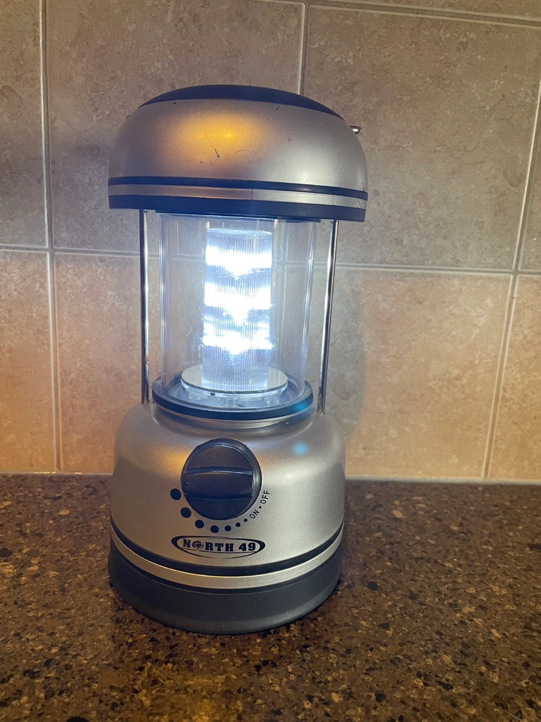 LED camping lantern. Portable and lightweight design. Features an on/off switch. Great for outdoor use.