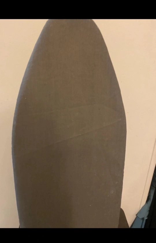 Wall-mountable ironing board. Grey padded cover. Metal frame and legs. Includes storage rack for iron and other items. Good used condition.