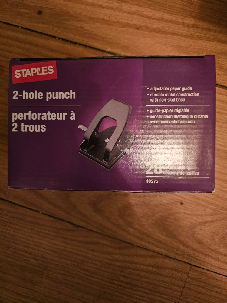 Two-hole punch. Durable metal construction. Adjustable paper guide. Non-skid base. 20 sheet capacity.