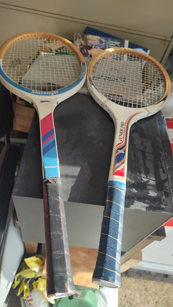 49Two vintage tennis racquets. One Slazenger, one Junior Pro. Wooden frames. Used condition.