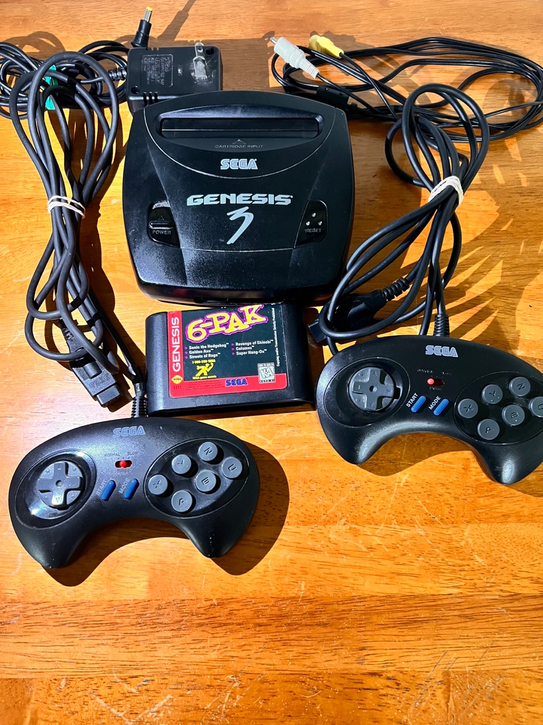 Sega Genesis 3 console, two controllers, power supply, AV cables, and a 6-Pak game cartridge included. Excellent for retro gaming. Everything tested and working great.