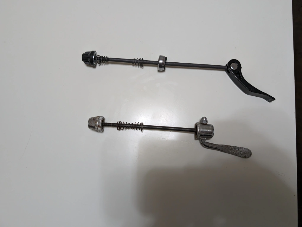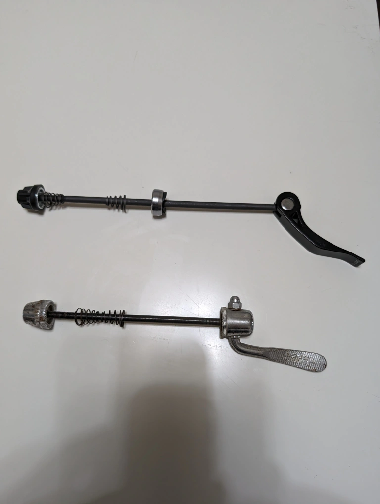 115Two used bicycle quick release skewers. One black, one silver. Suitable for bicycle wheel removal. Removed from my Cannondale bike