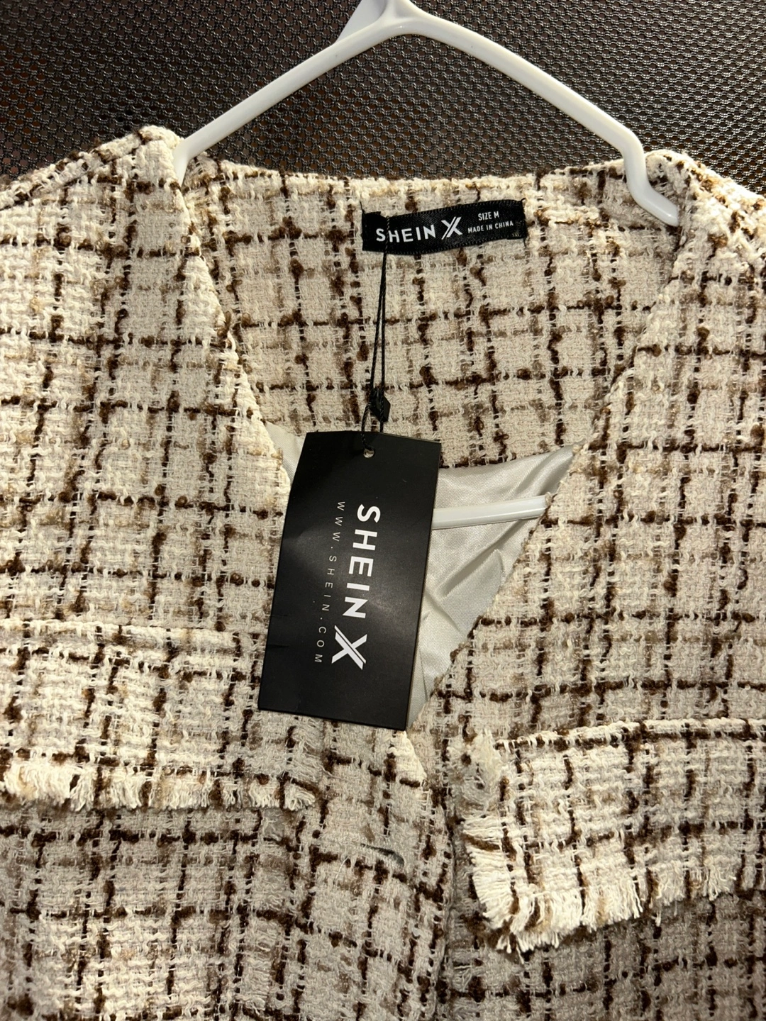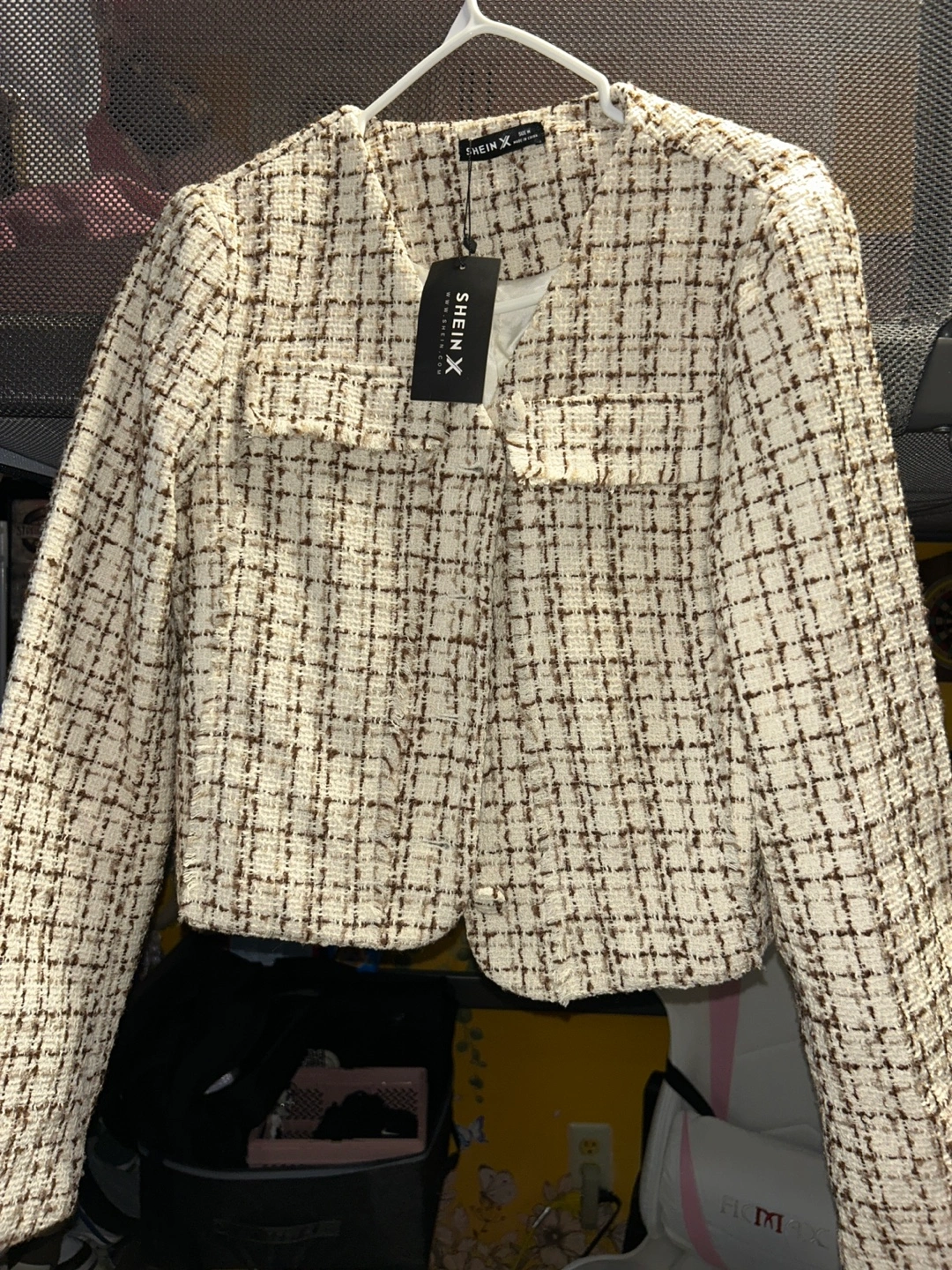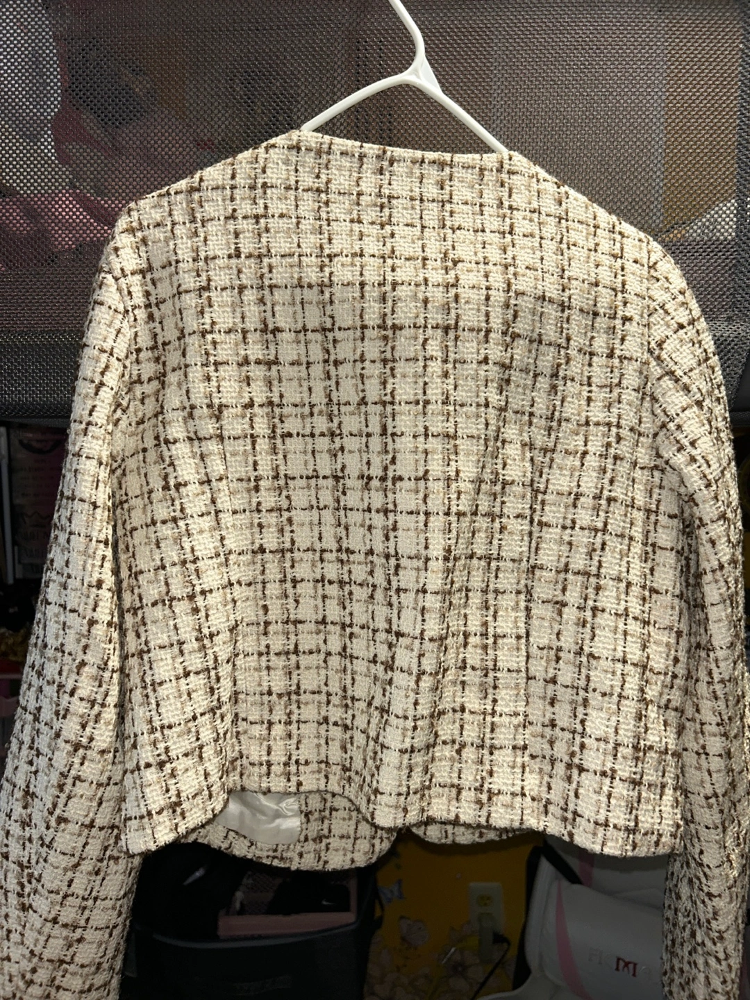 Cropped tweed jacket. Brown and white colour block pattern. Long sleeves. New with tags.