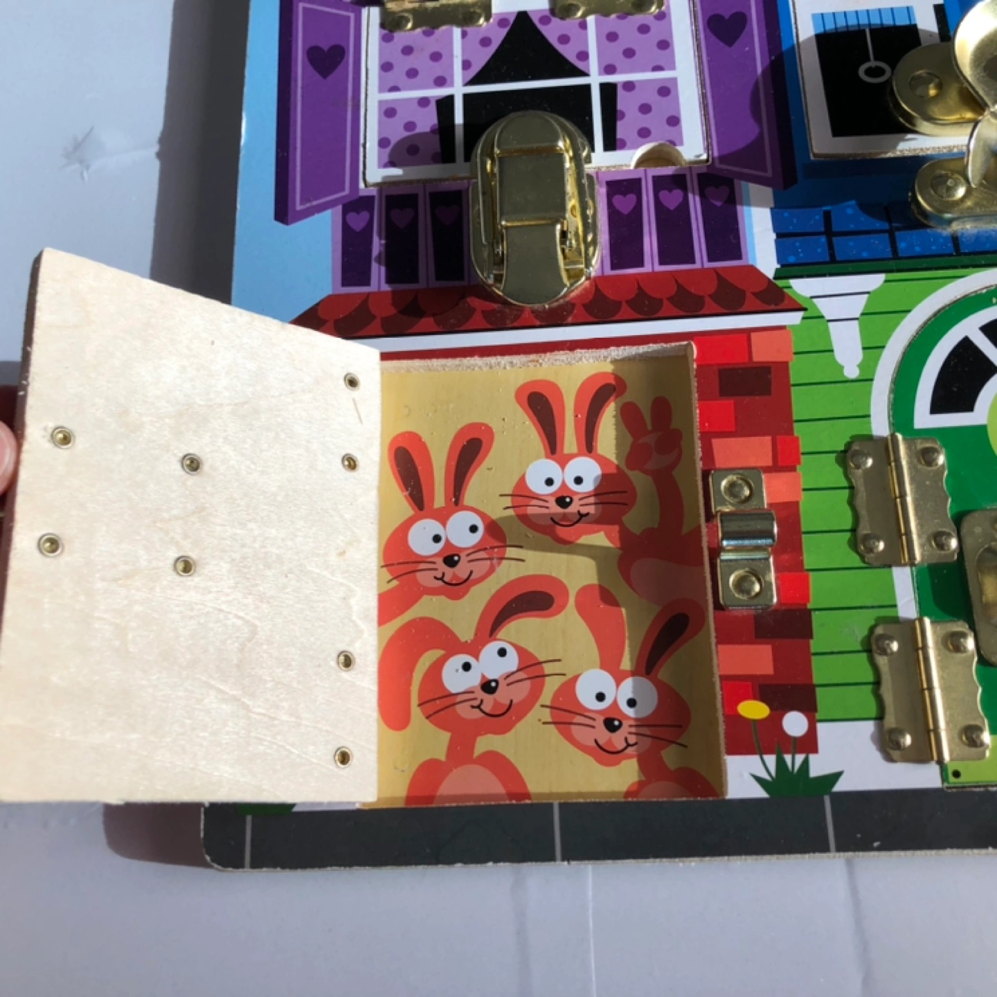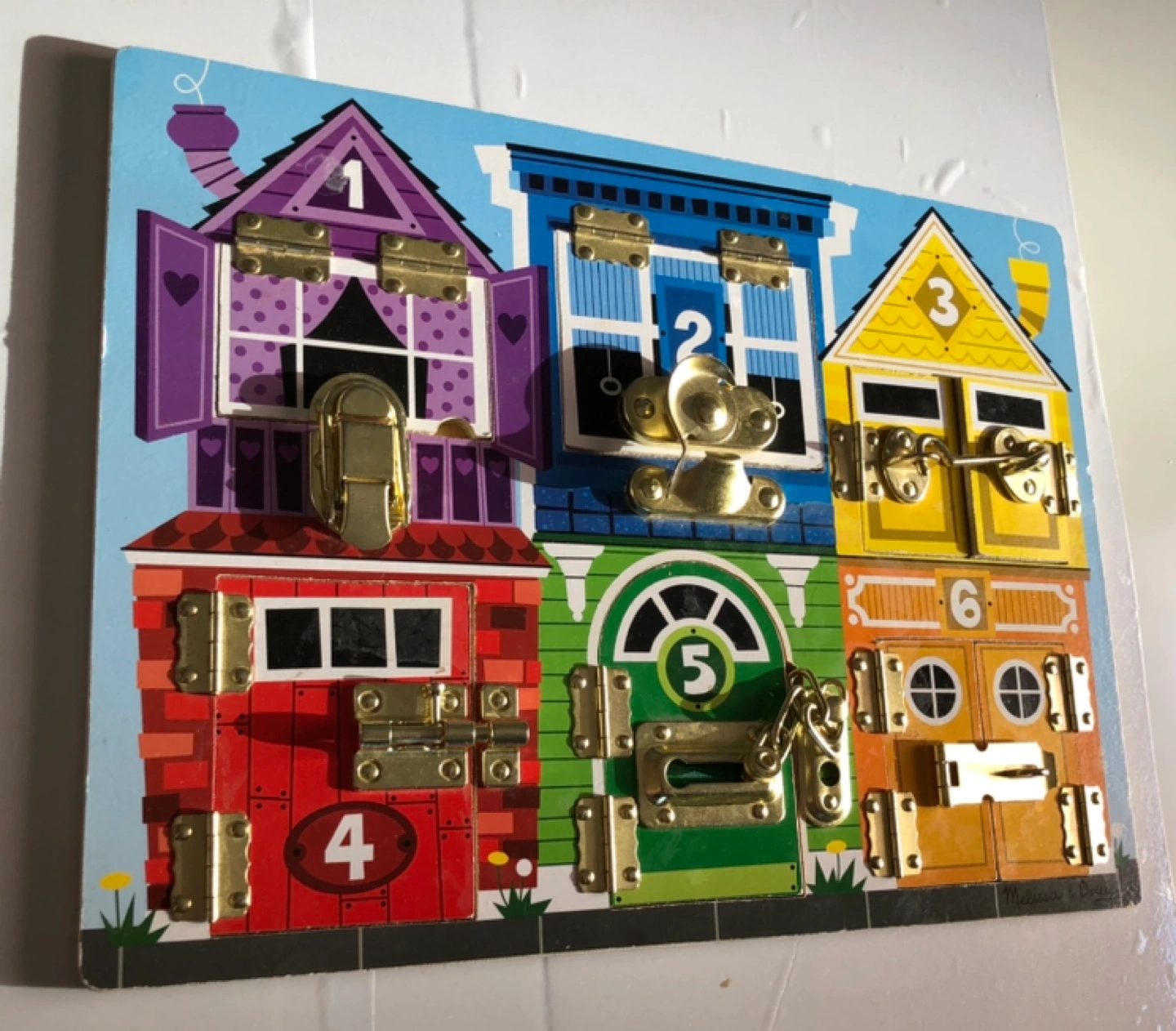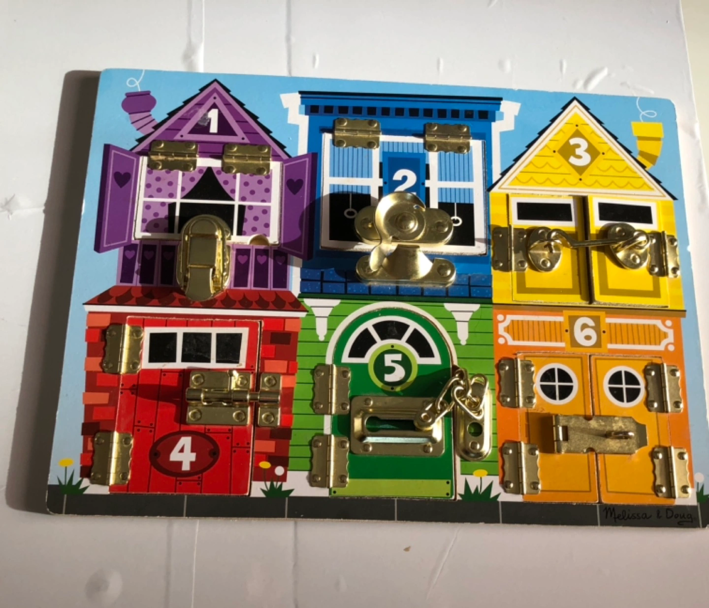 Fun and entertaining toy, helps develop fine motor skills, while learning colors, numbers and animal names. Six colourful houses, each with a different latch or lock. Great for toddlers.
