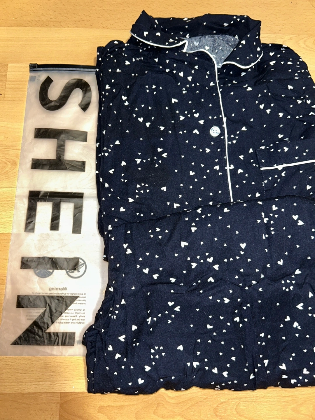 Cute pajama set. Navy blue with small white hearts. Long sleeves and pants. Button-up top. Excellent condition.