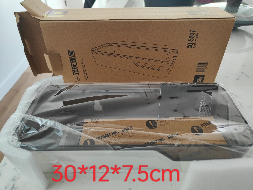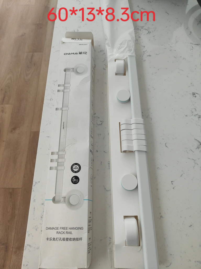 Two new storage organizers. One is a wall-mounted container, perfect for organizing small items. Measurements: 30*12*7.5cm. The other is a damage-free hanging rack rail, ideal for hanging items. Measurements: 60*13*8.3cm. Both are brand new and come with all original packaging. 2 sets of each item are available. $10 of each.
