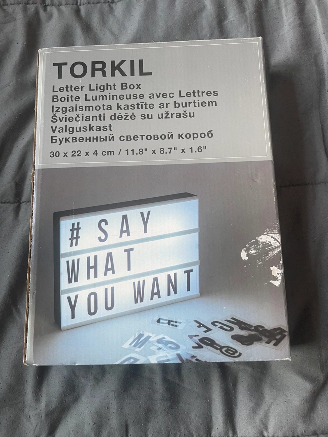 Buy & SellTORKIL Light Box with LettersTORKIL Light Box with Letters$15New in box. White light box. Includes extra letters. Perfect for messages or decor.ConditionNewWHERE TO MEETCheck LocationView MapSELLERBELLASUNByron150 reviews0 chats·1 favorites·12 views