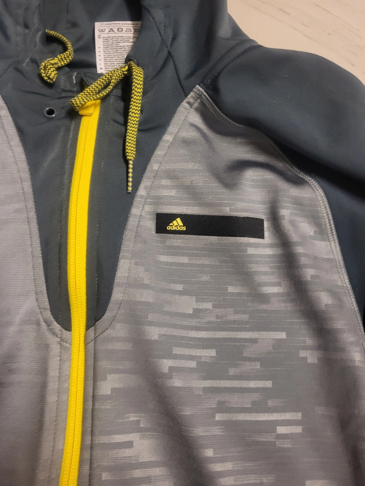 Men's Adidas zip-up hoodie. Grey and teal colour block design. Yellow zipper. Size small. Good condition.