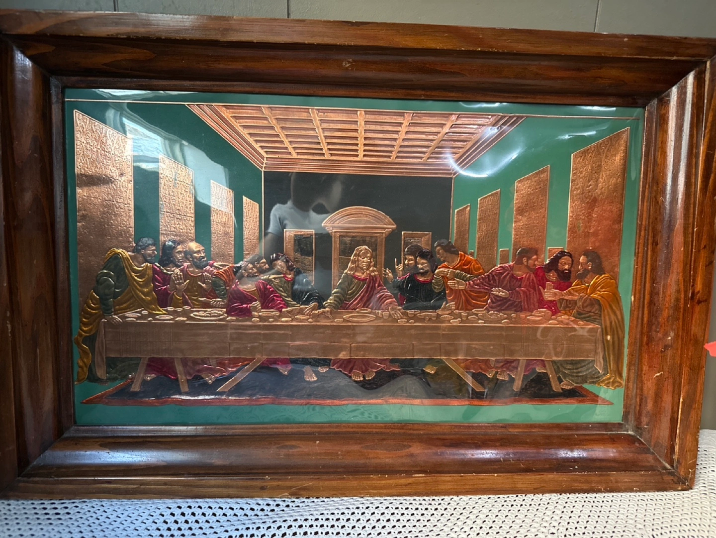 Beautiful vintage framed copper relief of Da Vinci's The Last Supper. Dark wood frame. Ready to hang. Shows some minor wear. And flower vase
