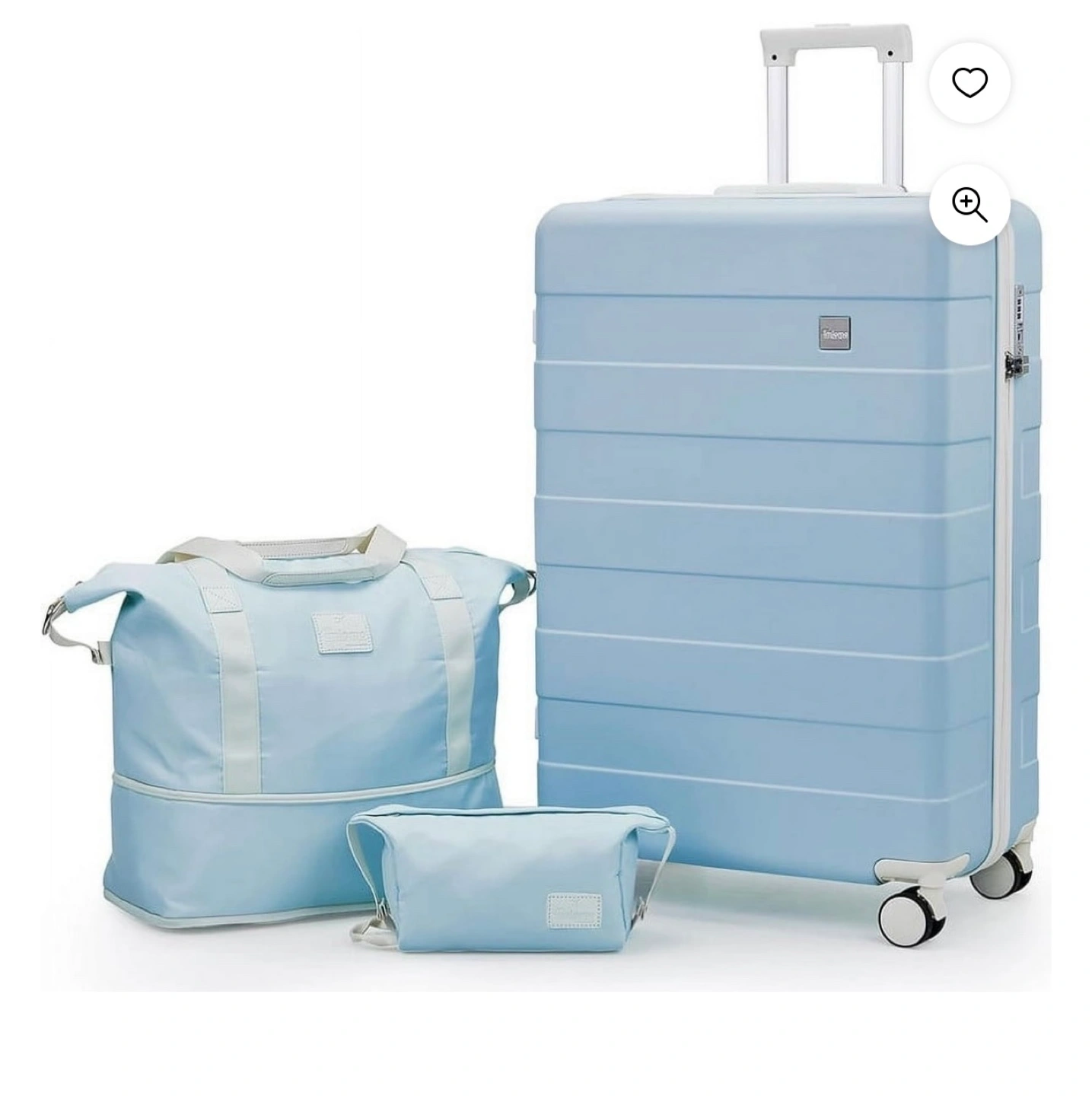 Three-piece luggage set. Includes a large suitcase with a 3-digit TSA combination lock, a weekender travel bag, and a cosmetic/toiletries case. Light blue colour. Perfect for travel!