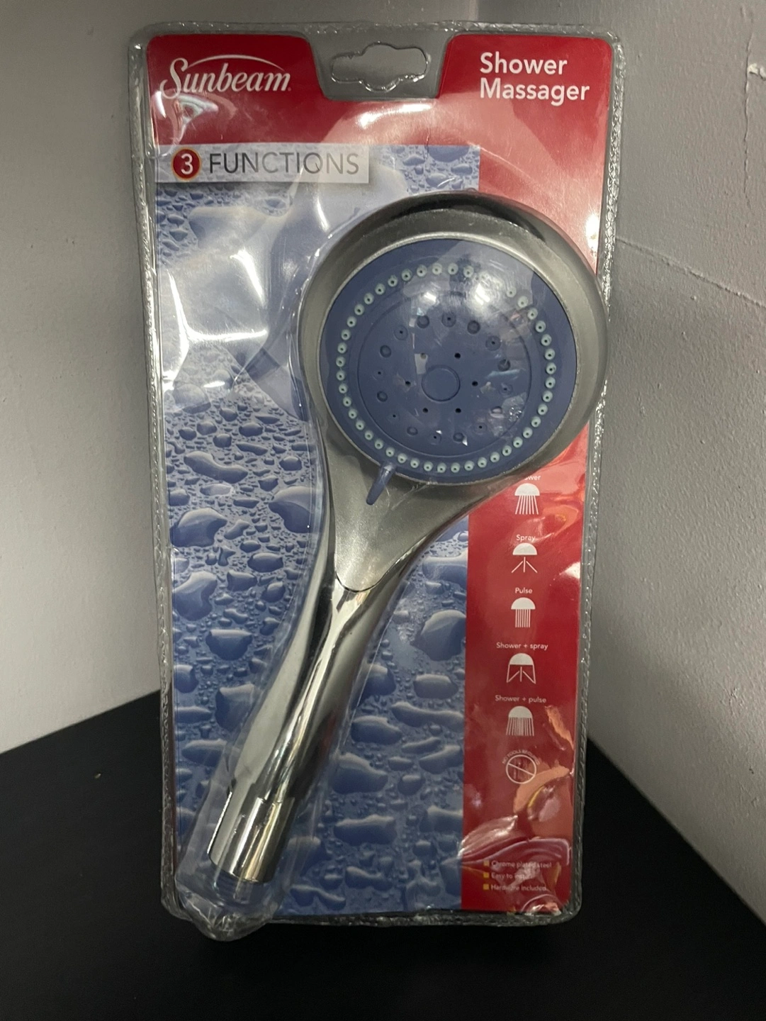 New in package. Chrome-plated steel. Easy to install. Hardware included. Three functions: massage, pulse, shower spray.