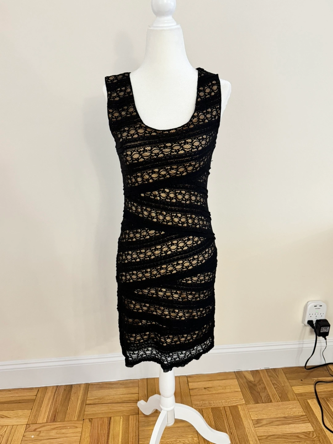 Sleeveless mini dress. Black lace overlay on a nude lining. Fitted silhouette. Great for a night out.