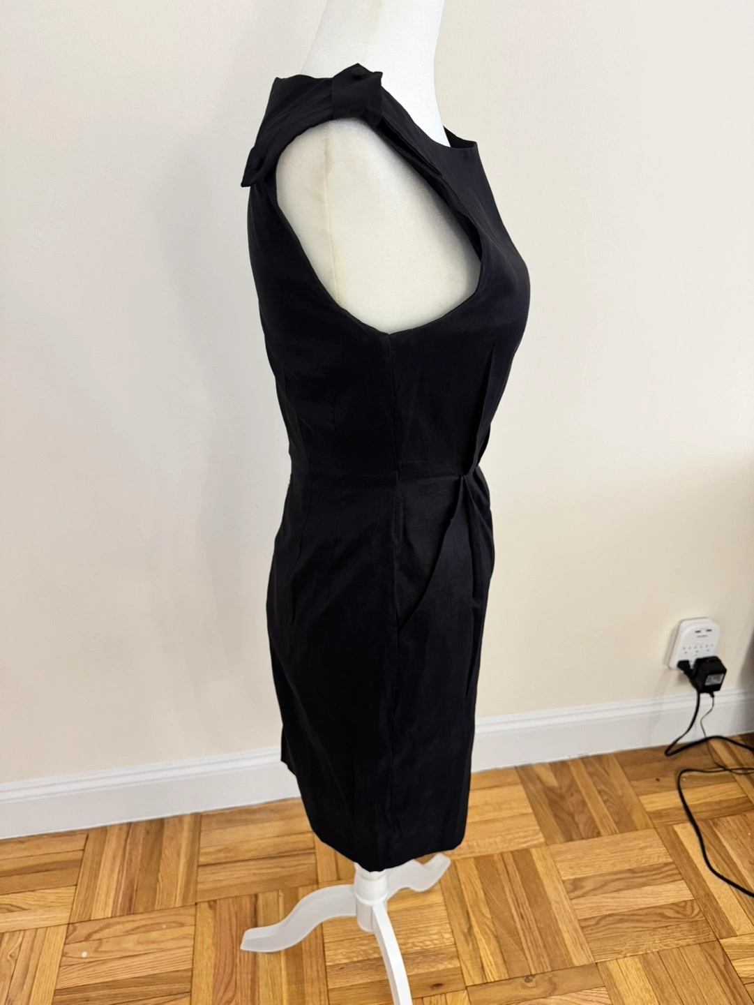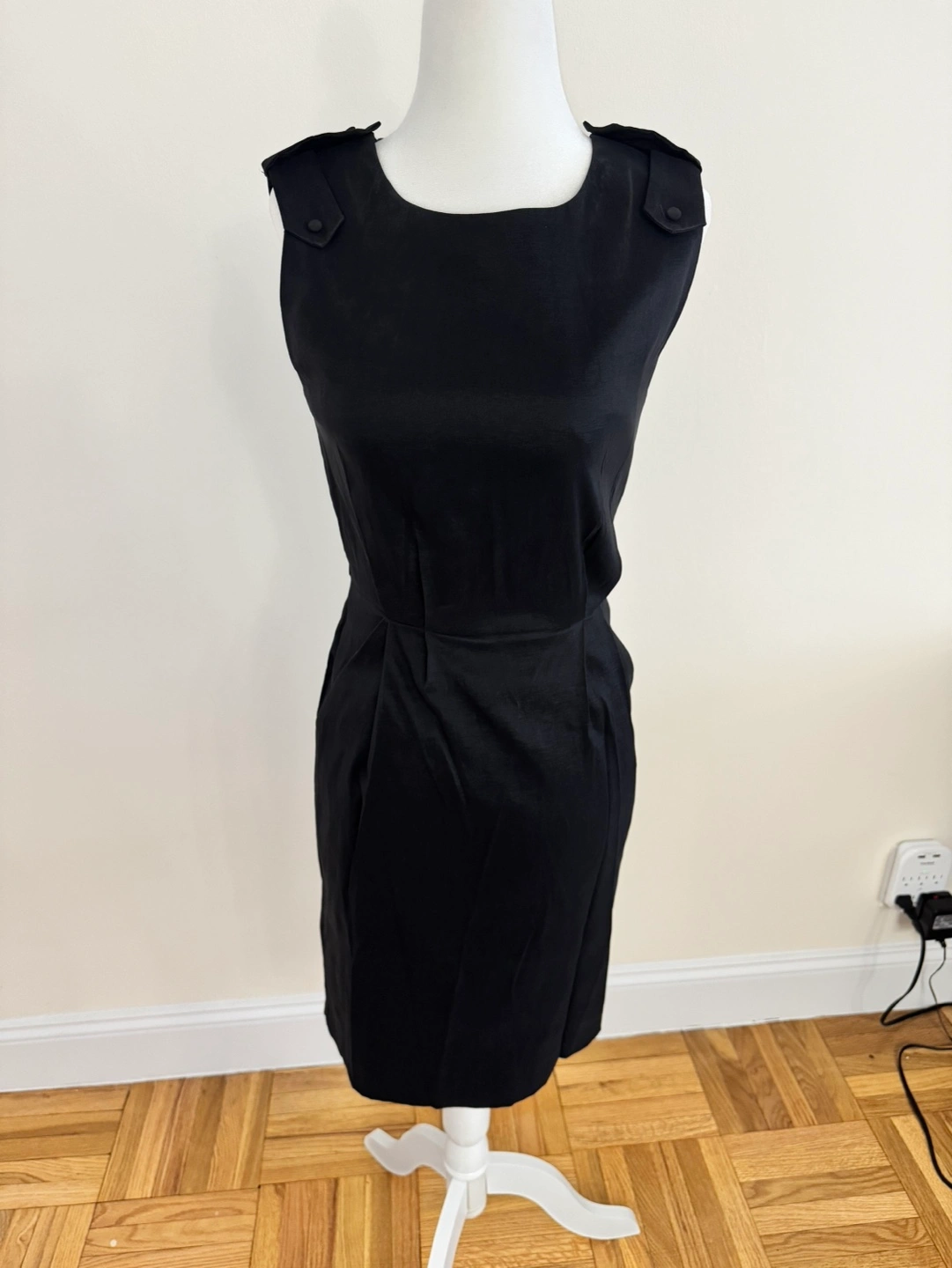 Black sleeveless fitted dress. Back zipper closure. Shoulder detailing. Pockets.
