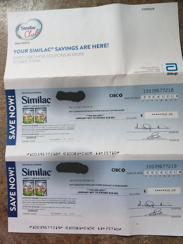 Two unused Similac coupons. Each coupon is worth $10.00 at any Canadian retailer where Similac is purchased. Expiry date: December 13, 2025.