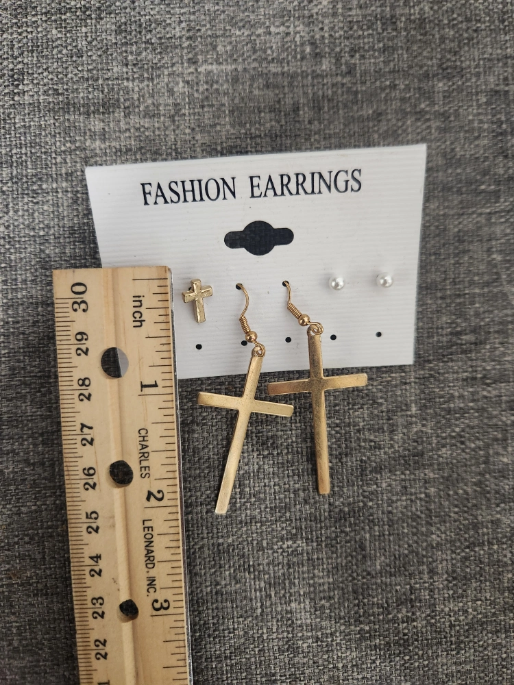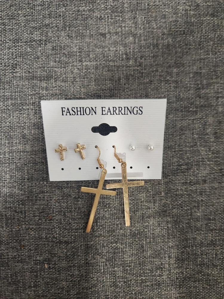 195Three pairs of earrings. Gold cross dangle earrings and small cross and pearl stud earrings. Great for everyday wear or special occasions.