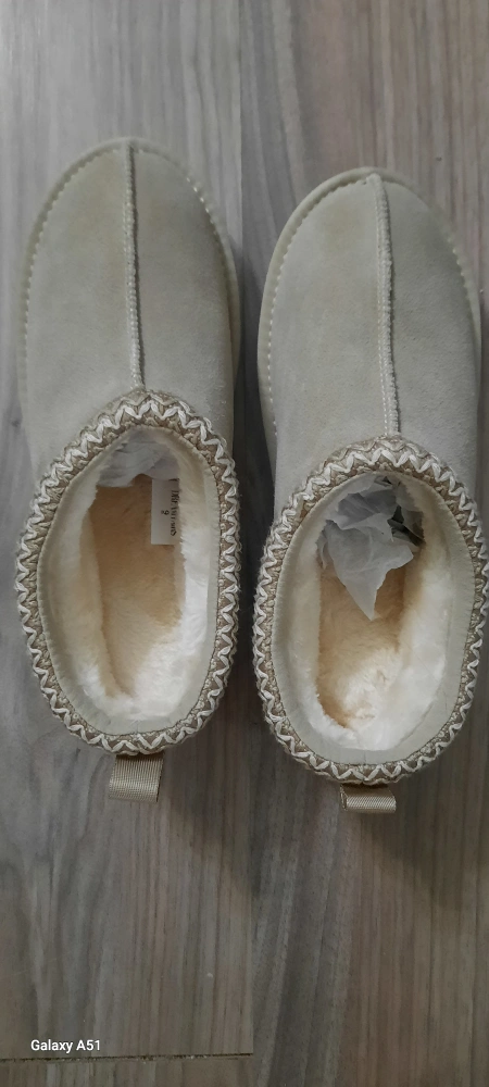 44Cozy and comfortable women's slippers. Size 9. Light beige suede-like material. Faux fur lining. Good for lounging around the house.