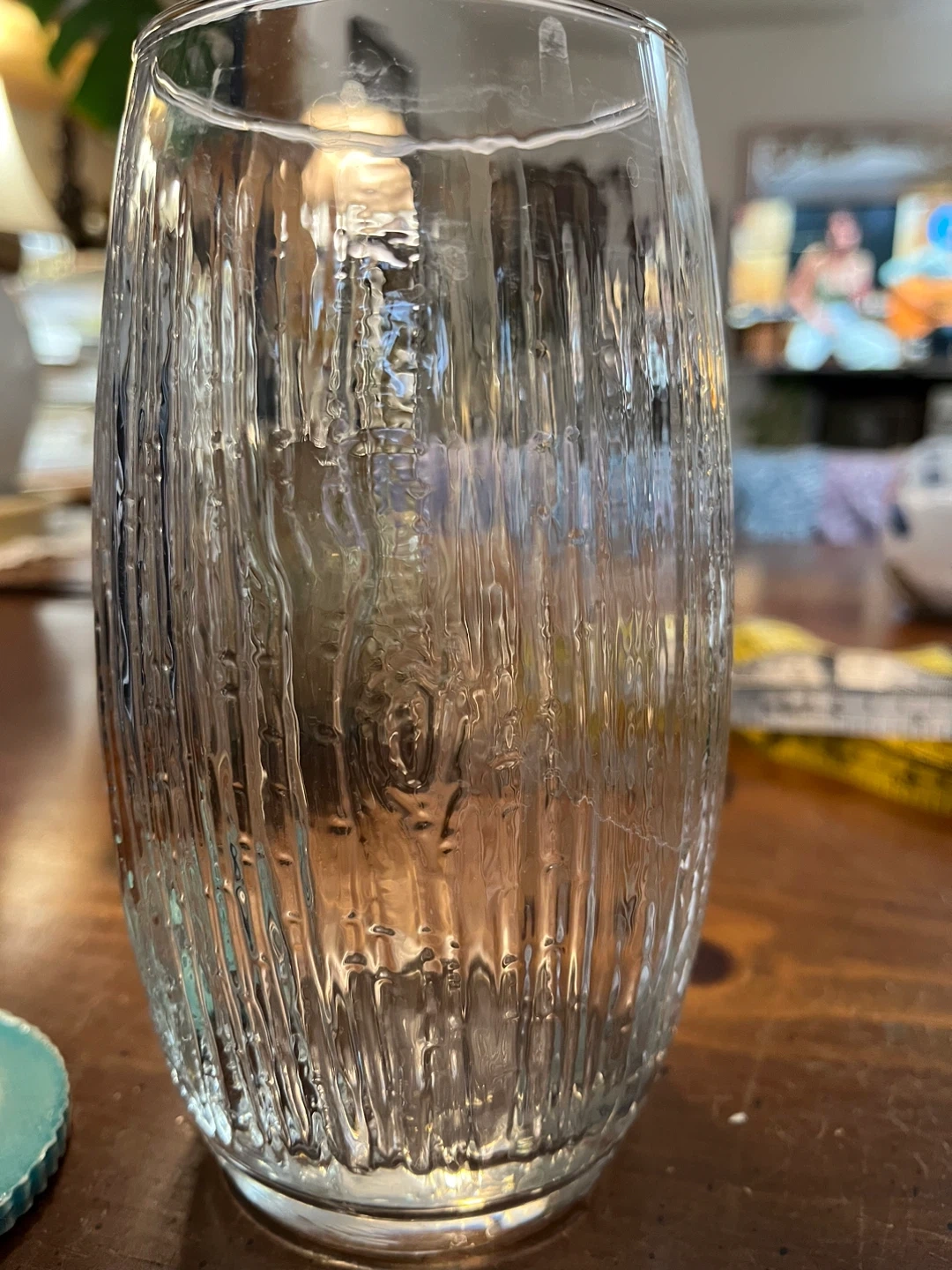 A clear glass vase with a wood grain textured surface. It comes with a decorative ceramic lid featuring multiple holes for arranging flowers. Perfect for small bouquets or single stems! The ceramic lid fits on many other containers including Mason jars.