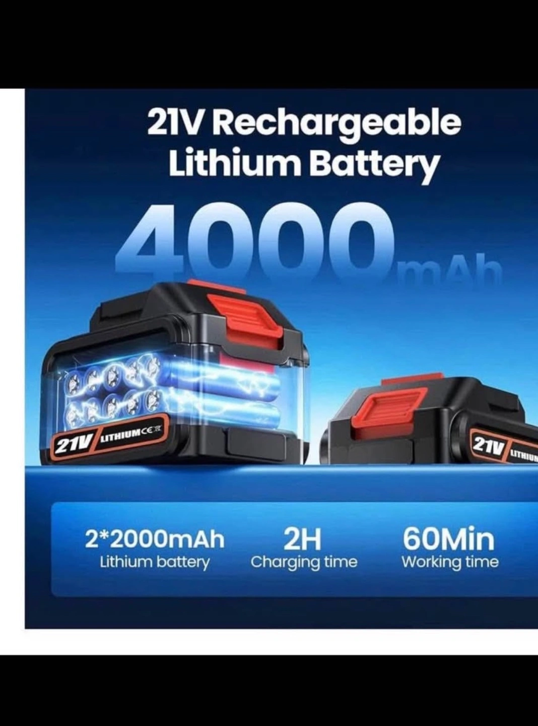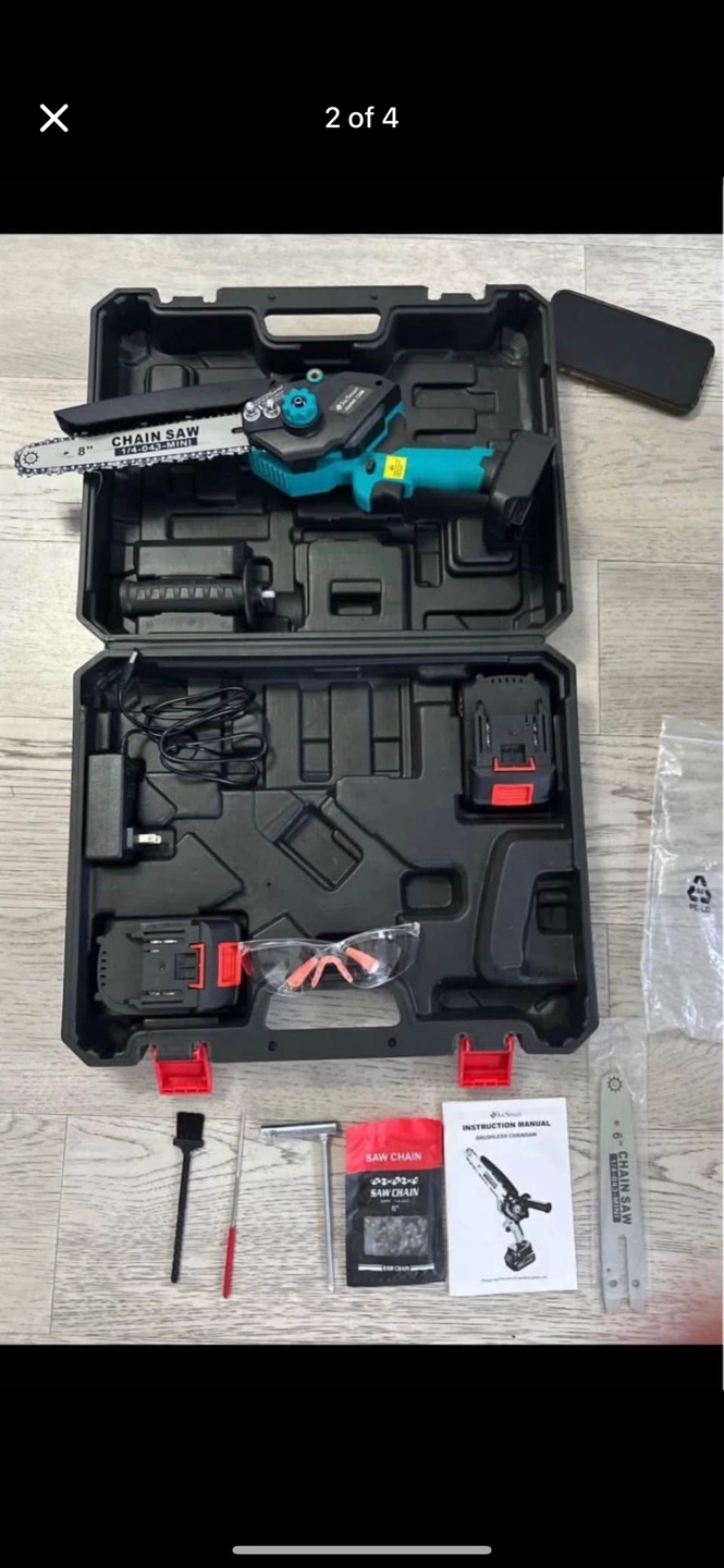 8 inch & 6 inch electric chainsaw. Two rechargeable batteries included. Complete with carrying case and accessories. Ideal for trimming branches and cutting wood.