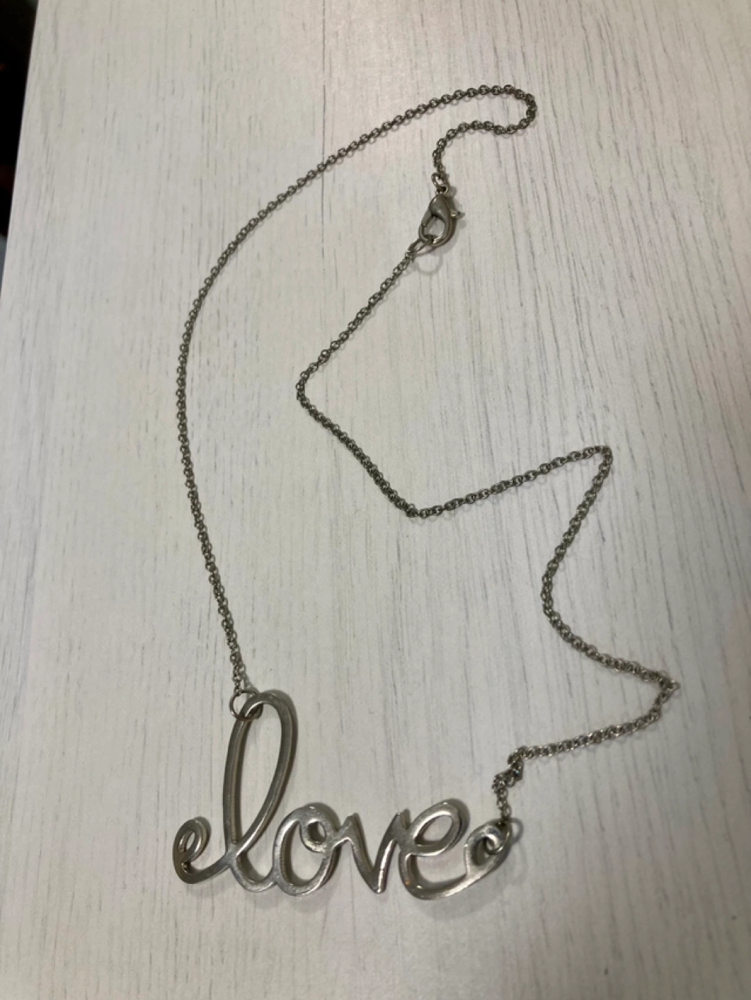 Silver “love” script on a 17” chain.