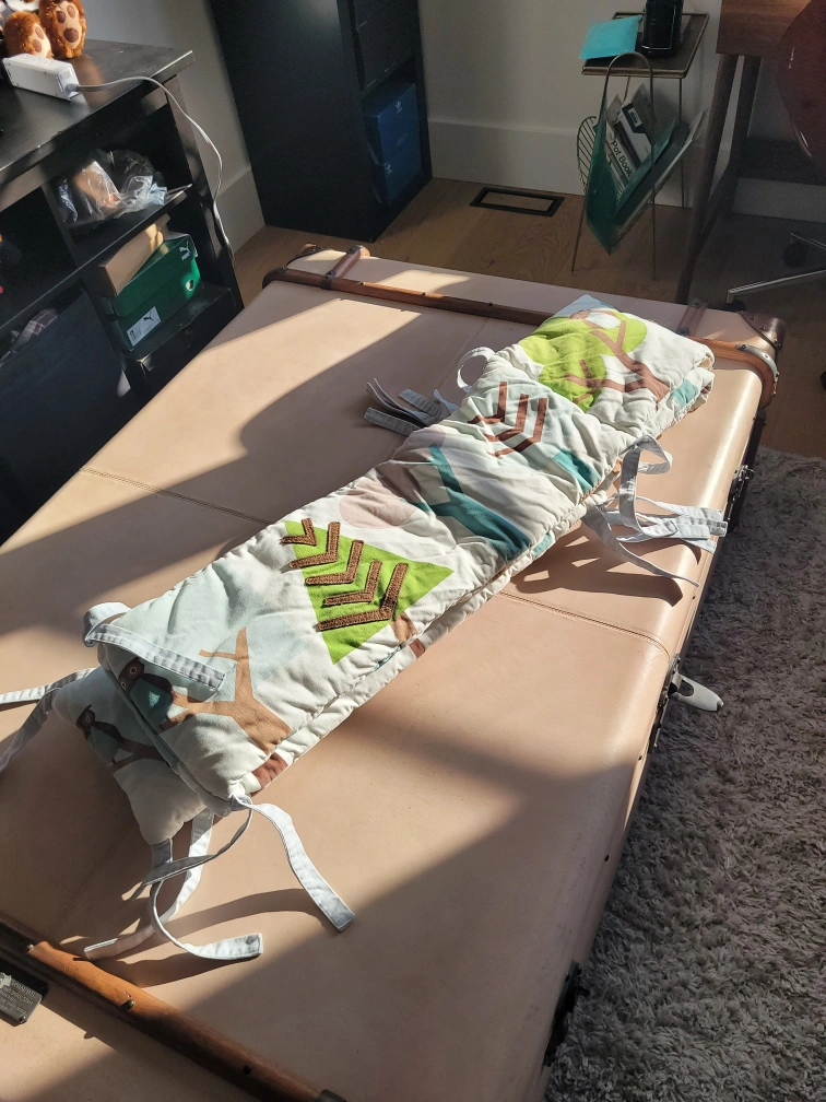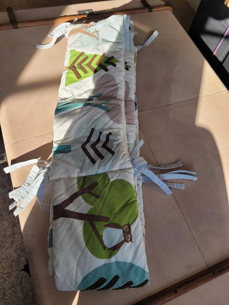Cute crib rail cover. Features owls and trees. Light blue, green, and brown colours. Soft padding. Ties for secure attachment.