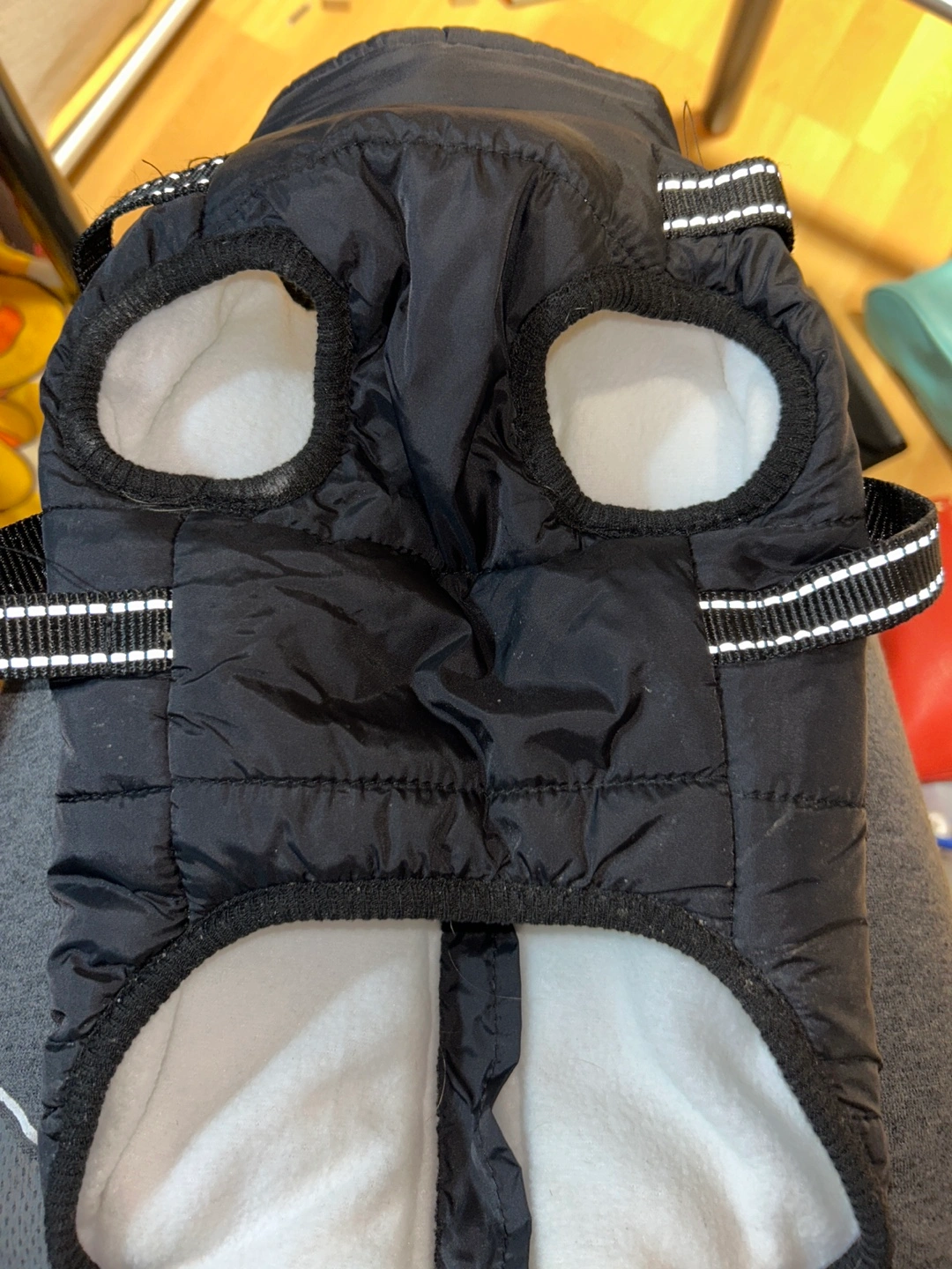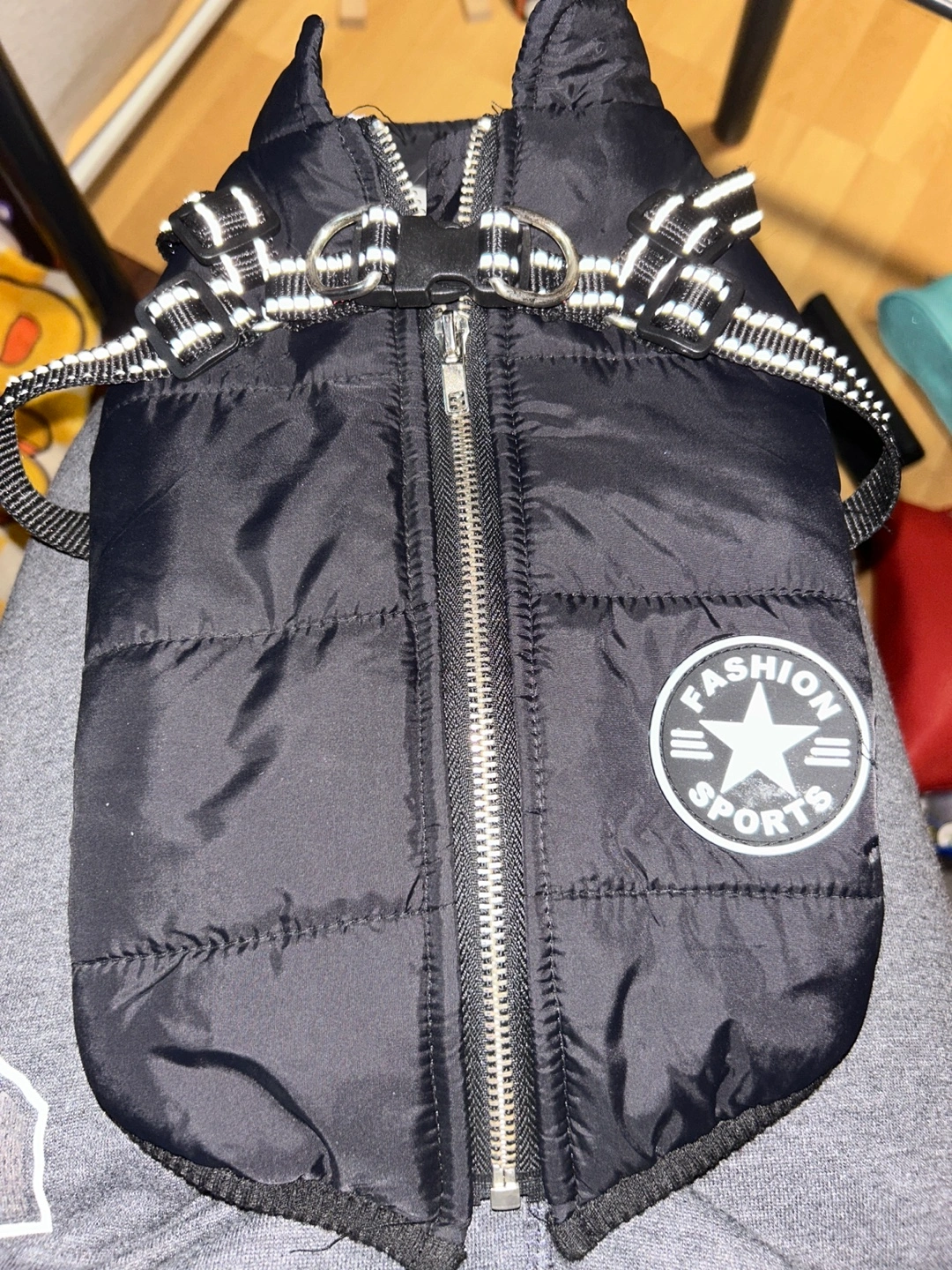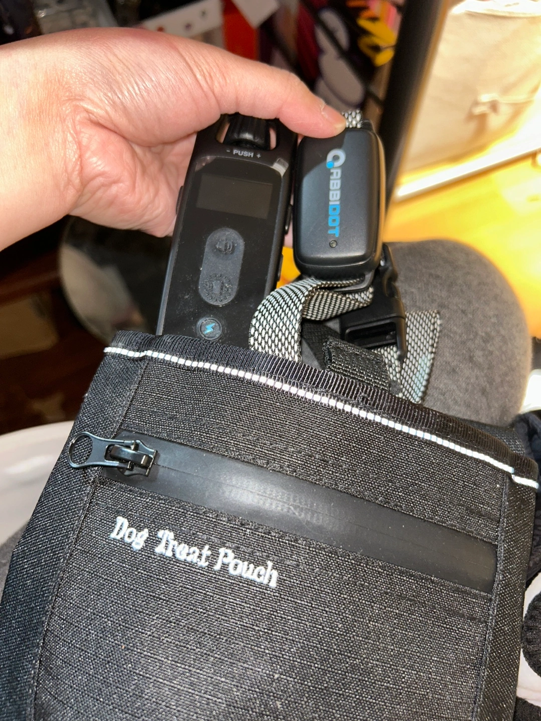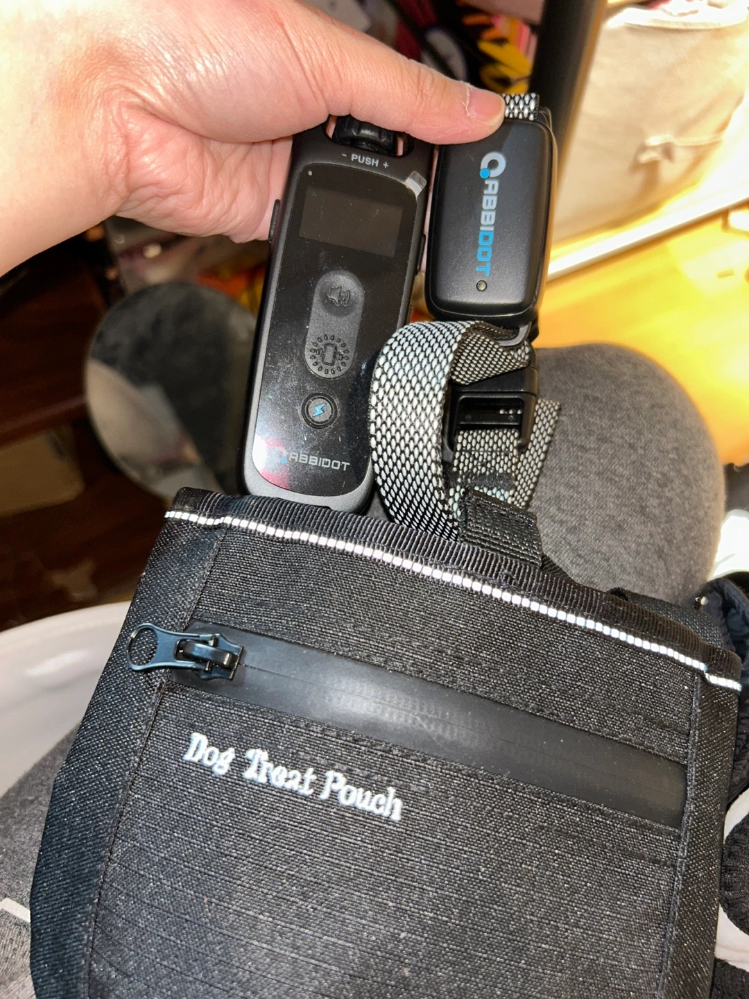 Includes Rabbitgoo remote trainer with receiver collar and treat pouch. Black dog vest with white piping. Zipper closure. Great for training and keeping your dog warm.