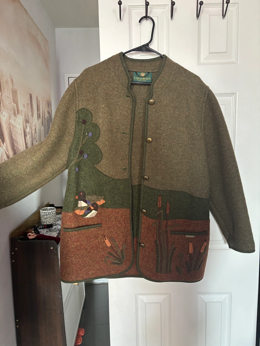 Vintage Giesswein wool jacket. Made in Austria. Features an embroidered nature scene on the back. Green, brown, and dark-green colours. Button closure. Long sleeves.