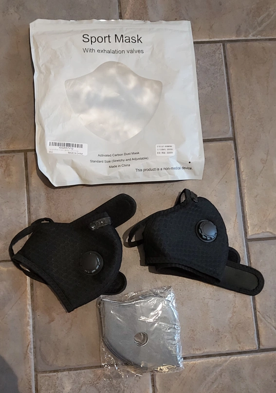 Two reusable masks. black masks with exhalation valves and grey filter. Standard size, stretchy and adjustable. Non-medical device.