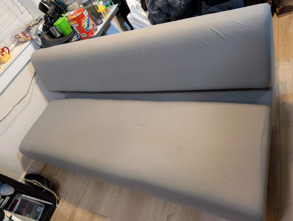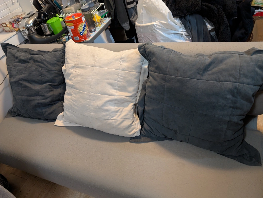 Comfortable grey fabric sofa. Three-seater. Includes three matching throw pillows. Minimalist design. Light wear.