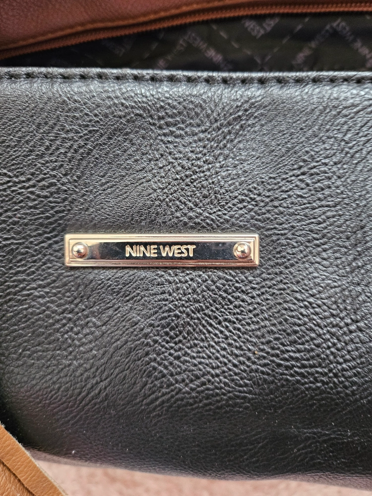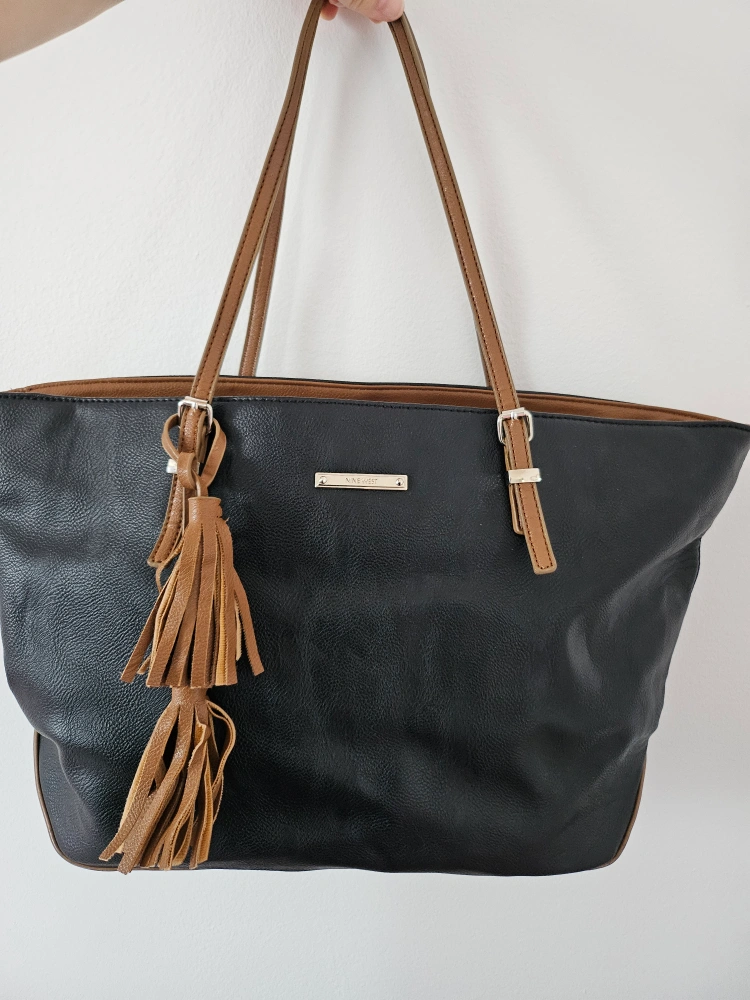 Large tote bag. Black with brown trim. Features two top handles and a tassel accent. Interior features multiple pockets. Faux leather.