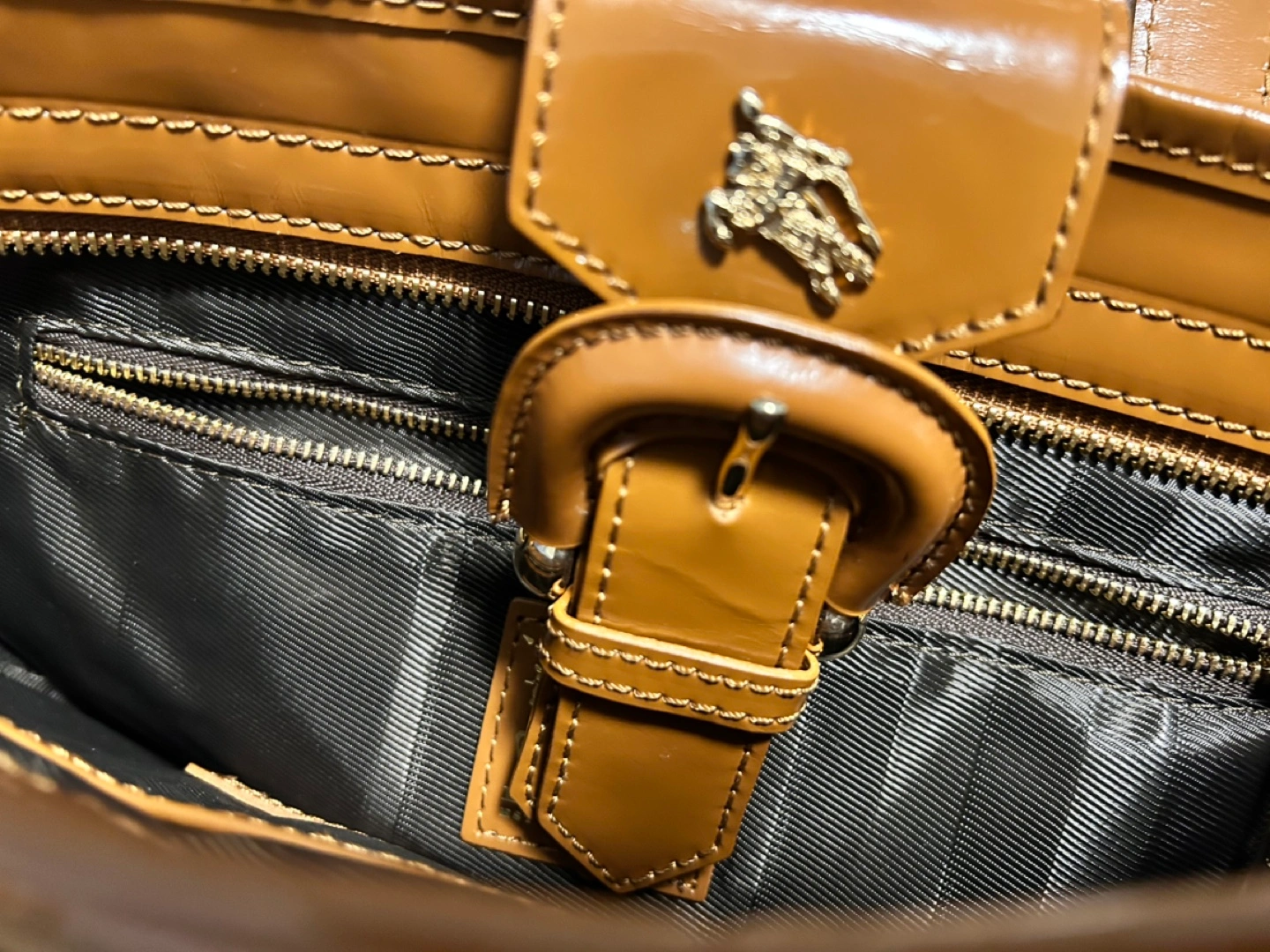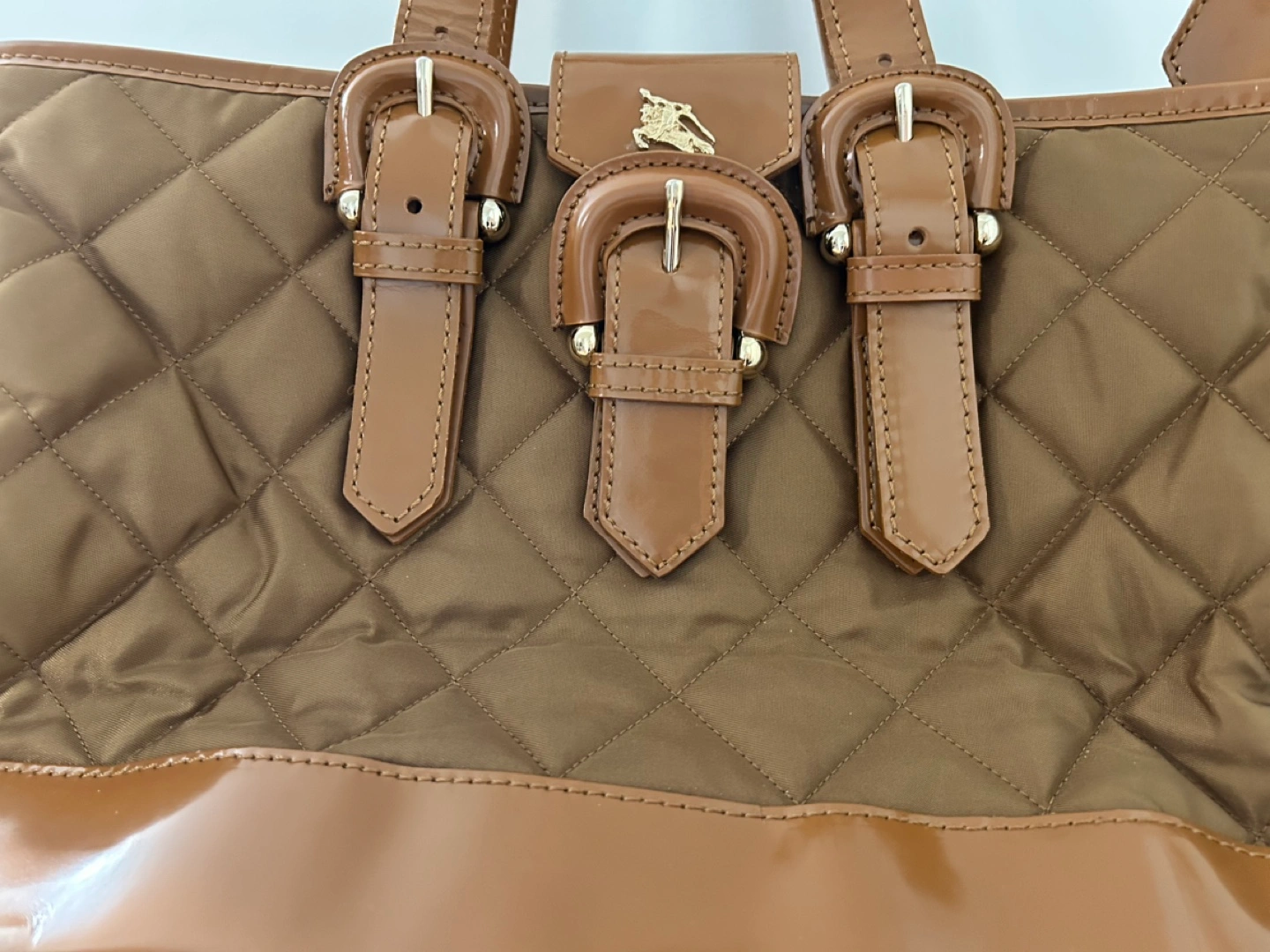 Brown quilted nylon tote bag. Features three decorative buckles and leather trim. Interior zippered pocket. Excellent for everyday use.