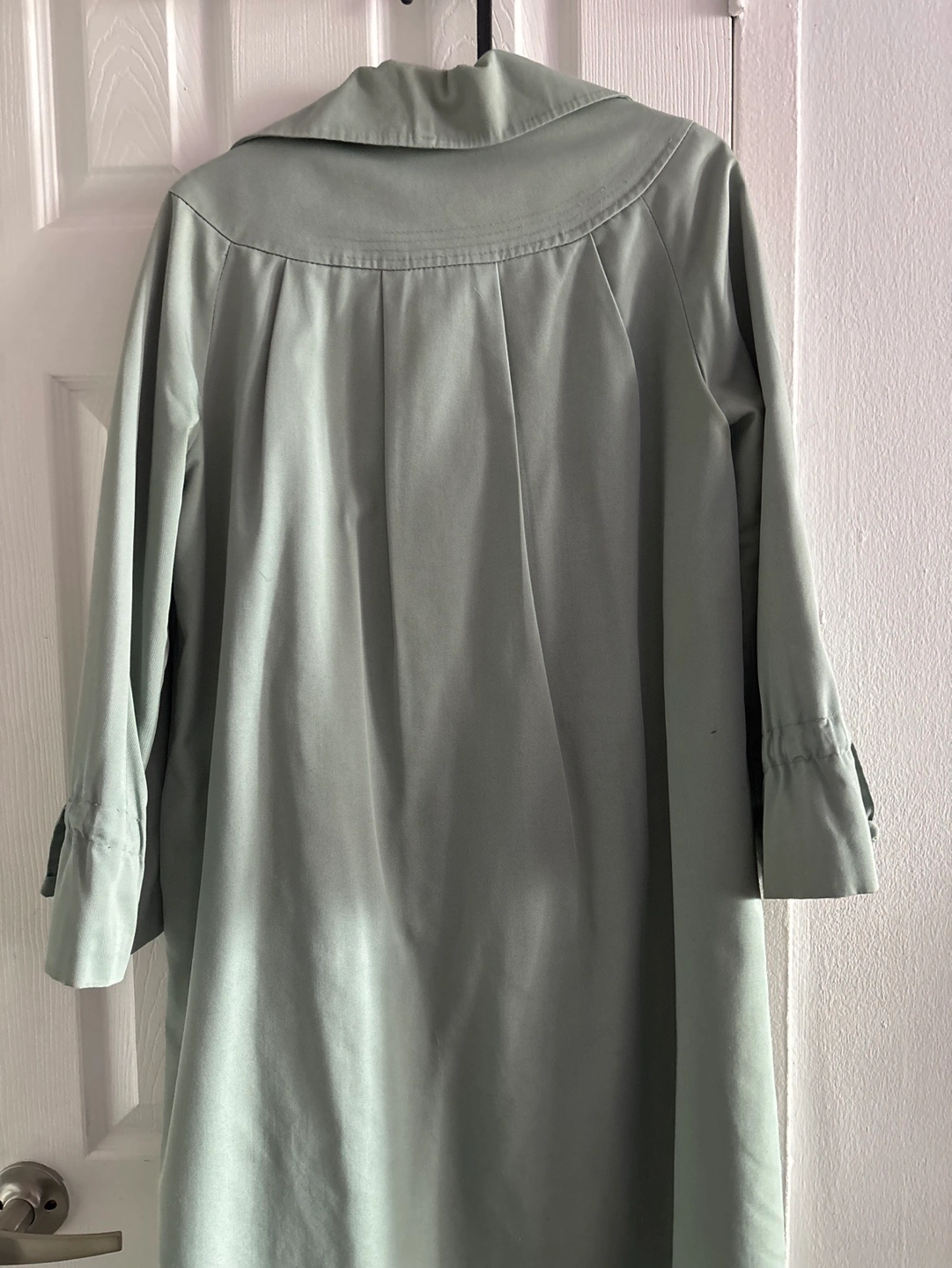 Women's vintage trench coat. Sage green exterior, light pink satin lining. Button closure. Three-quarter sleeves with tie detail. Classic collar. Excellent condition.