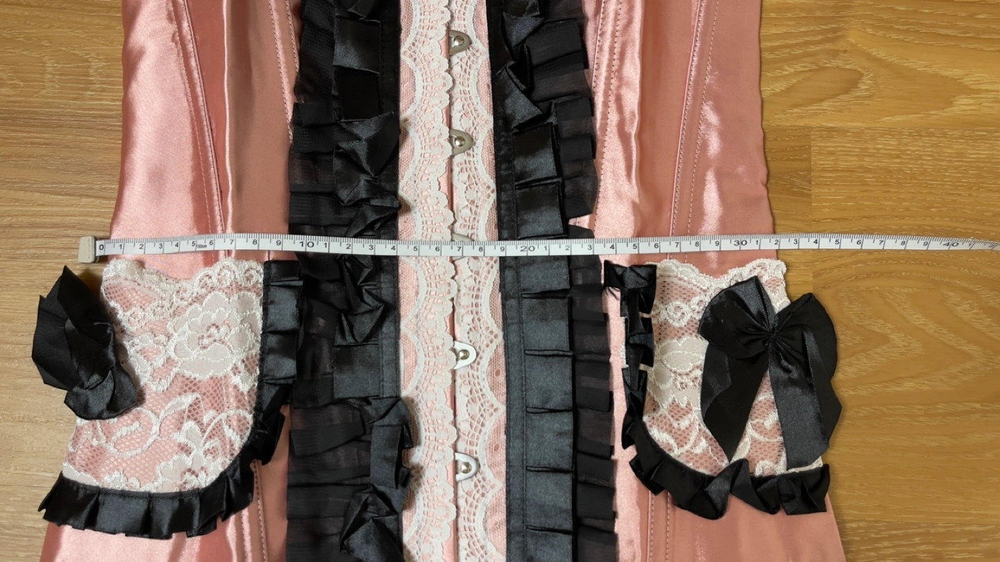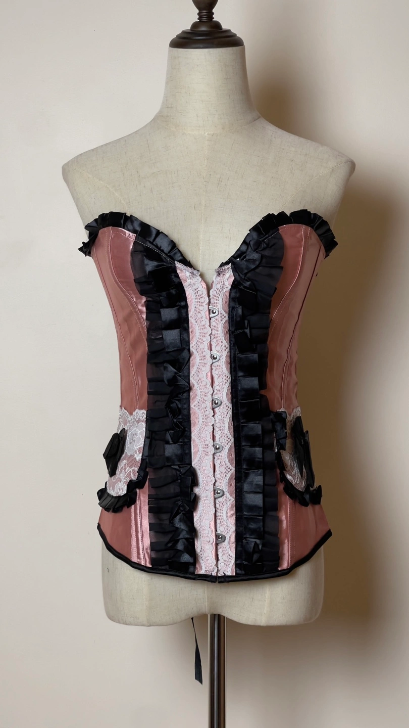 Features a beautiful blush pink satin exterior, black ribbon accents, and delicate white lace. Front closure with metal hooks and eyes. Back lacing for adjustability.