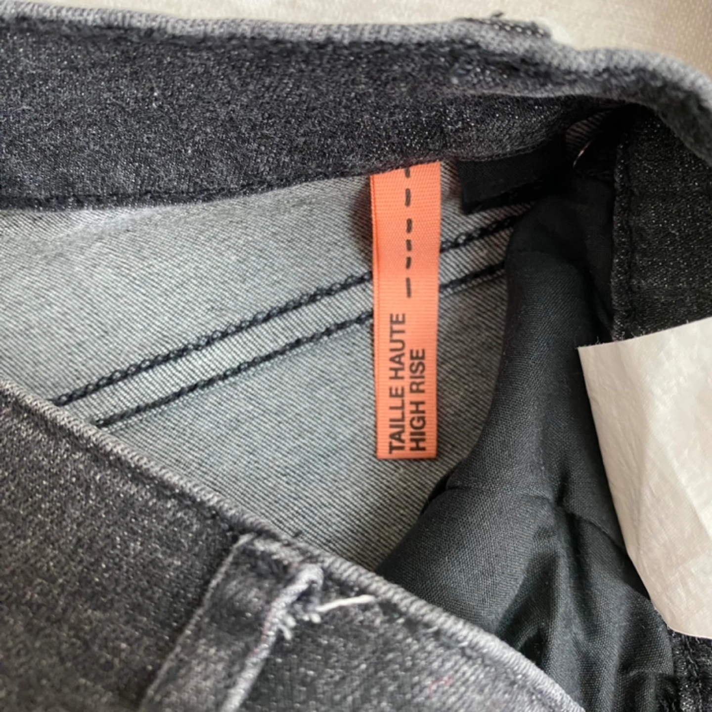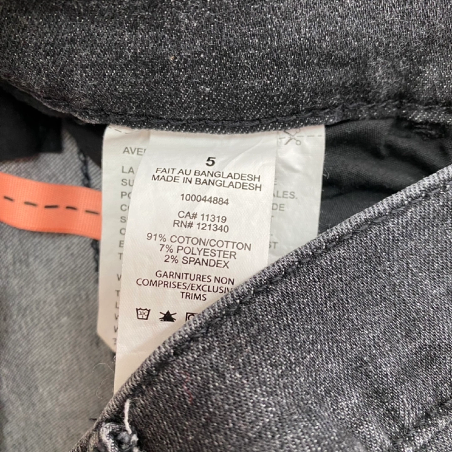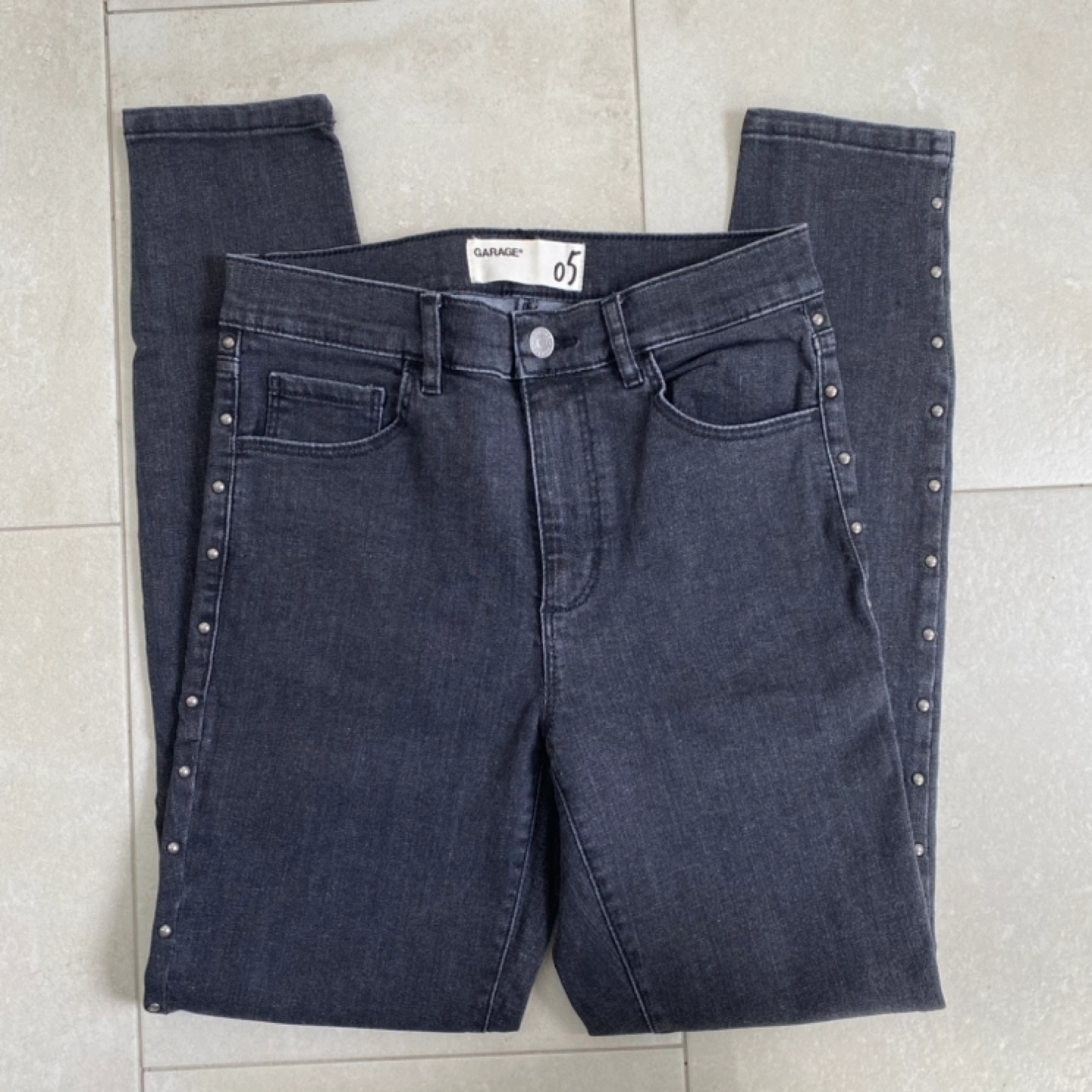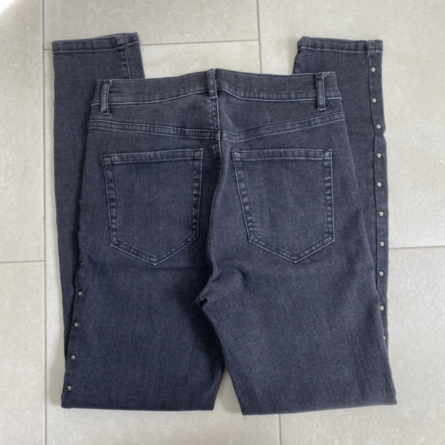 Dark wash skinny jeans. Metal studs along the sides. Size 5. 91% cotton, 7% polyester, 2% spandex.