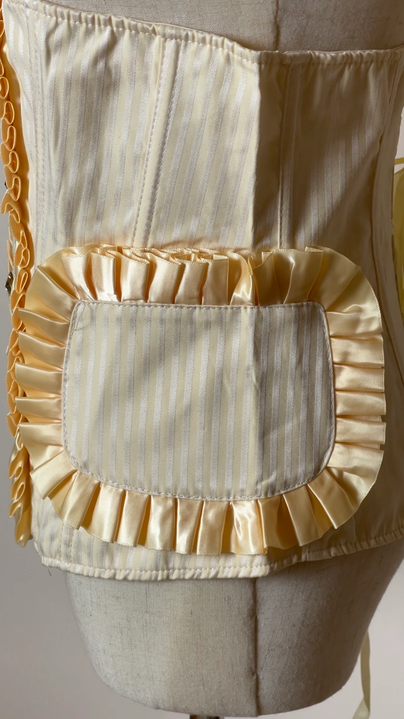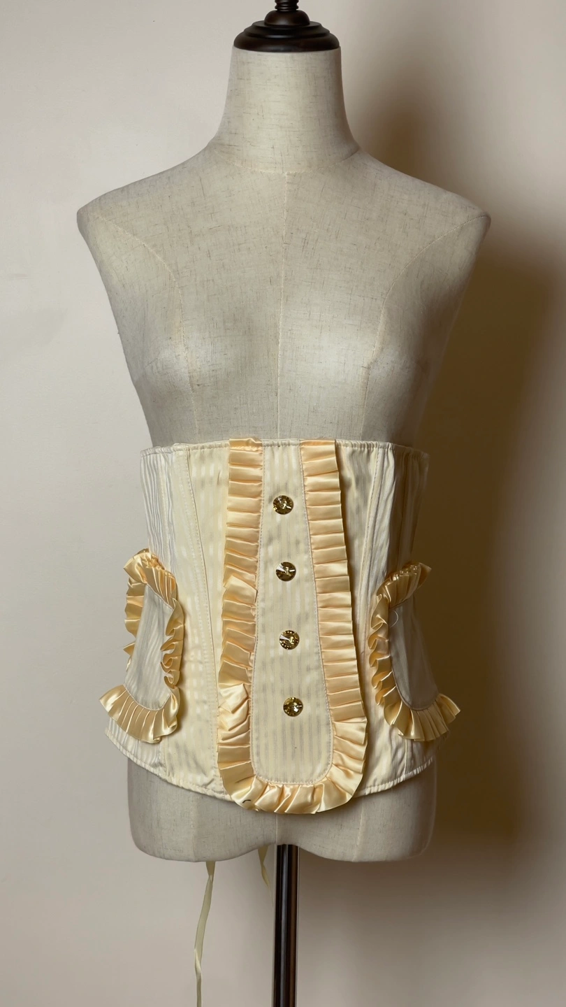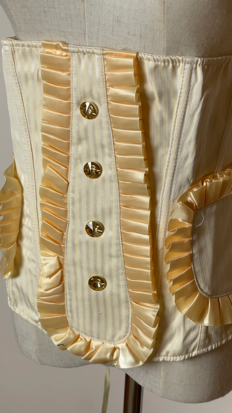 Elegant cream-coloured corset. Features thin stripes and ruffles. Back lacing. Gold-toned buttons. Unique pockets on the sides.