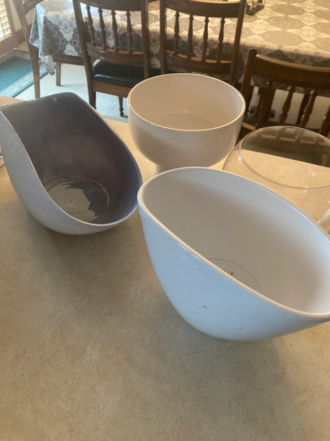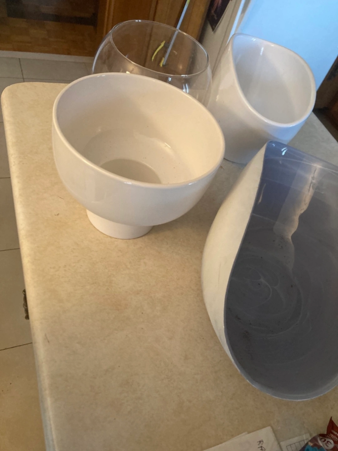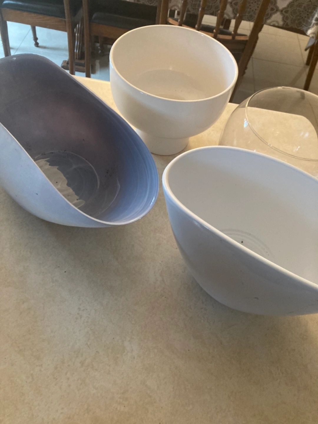 Four unique bowls, two white, one light purple, and one clear glass vase. Perfect for home decor or floral arrangements. Varying shapes and sizes. Pre-owned, good condition.