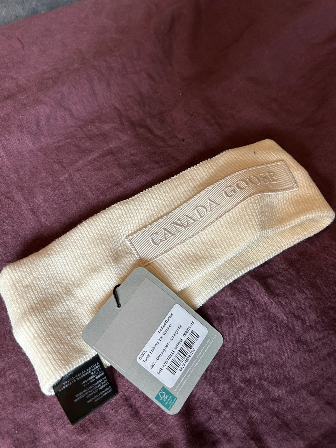 Cream-coloured ear warmer. Features the Canada Goose logo. Excellent condition. Never worn, tags on.