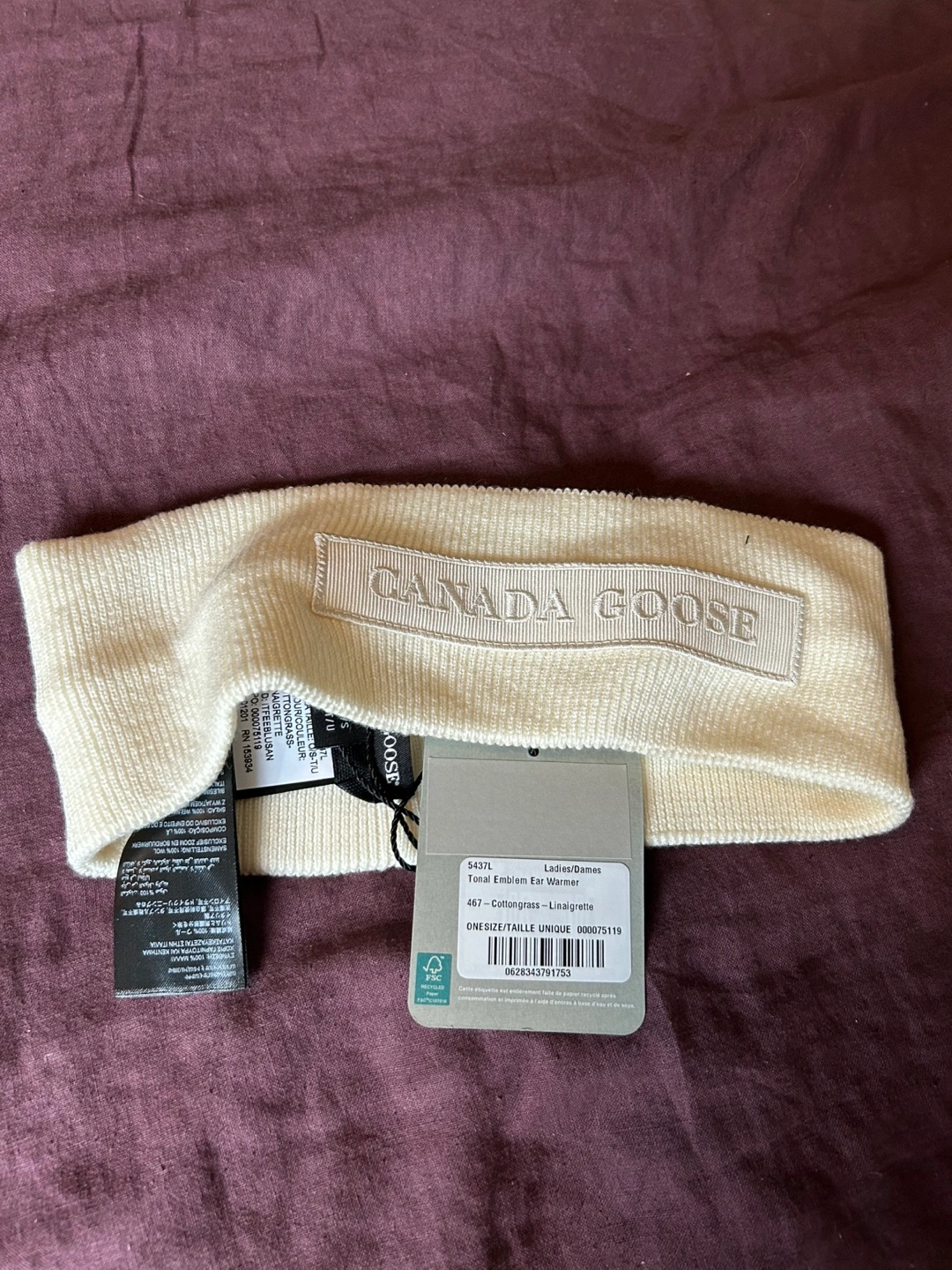 Cream-coloured ear warmer. Features the Canada Goose logo. Excellent condition. Never worn, tags on.