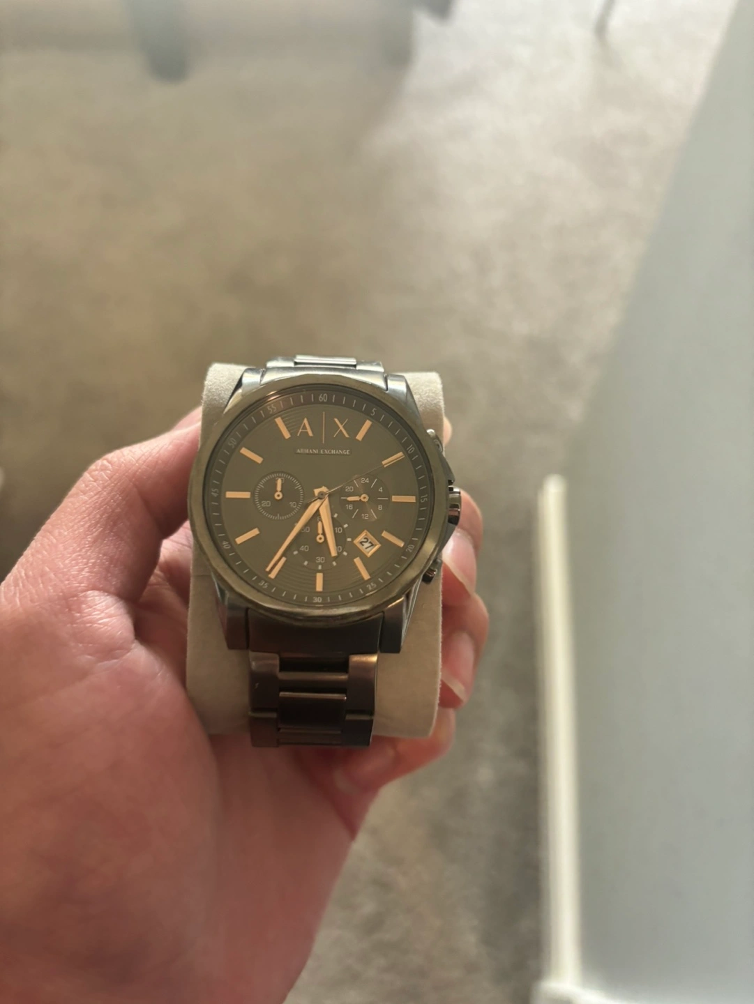 Men's chronograph watch. Grey stainless steel band and case. Rose gold accents. Quartz movement. Retails for $312. Price is negotiable