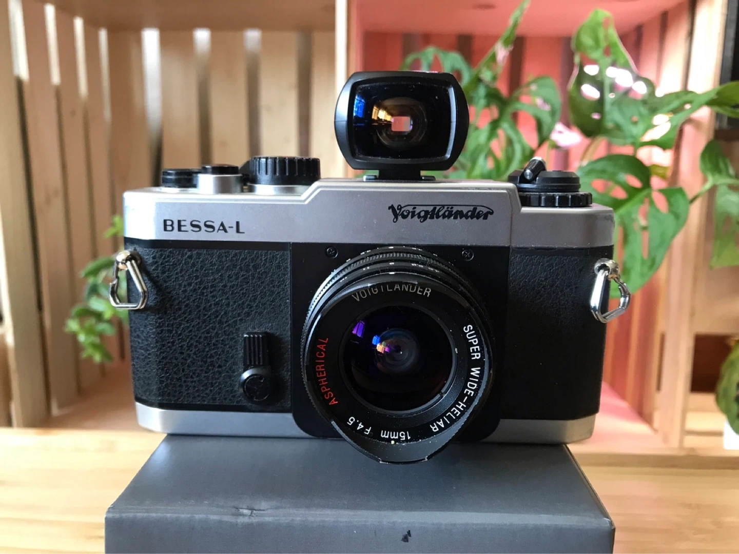 This is a Voigtländer Bessa-L 35mm film camera. It's paired with a Voigtländer 15mm f/4.5 Super Wide-Heliar Aspherical lens. This camera is known for its compact design and manual controls.